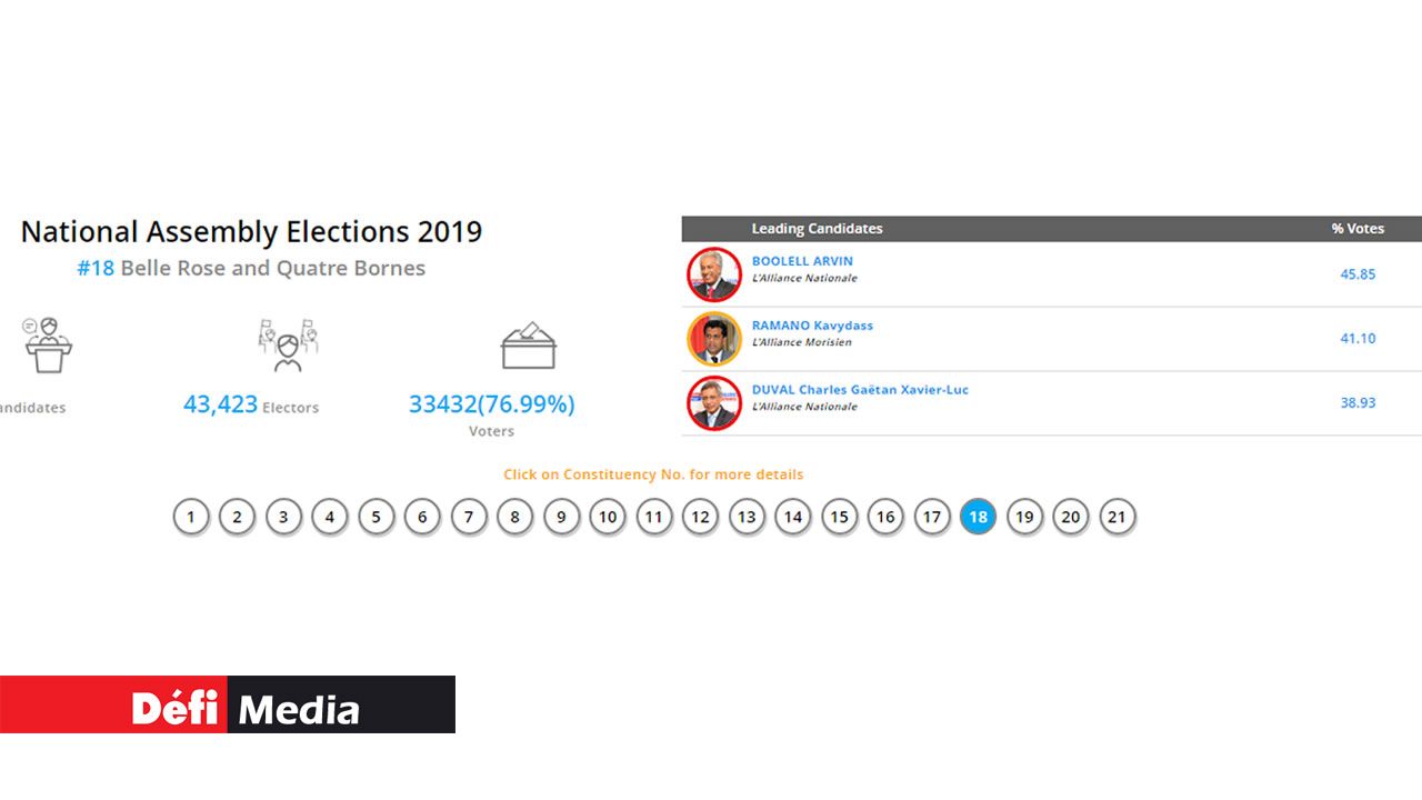Arvin Boolell de l’Alliance Nationale (PTr-PMSD-Mouvement Jean-Claude Barbier) est actuellement en tête dans la circonscription no 18 (Belle-Rose/Quatre-Bornes), ce vendredi 8 novembre.