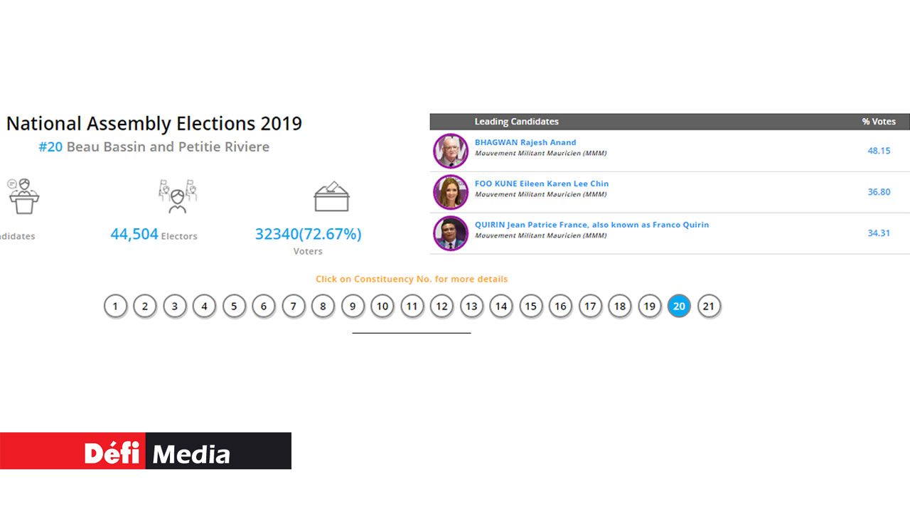 Rajesh Bhagwan, Karen Foo Kune et Franco Quirin, les trois candidats du MMM sont en tête dans la circonscription no 20 (Beau-Bassin/Petite-Rivière) après le premier pointage, selon le site de la Commission électorale.