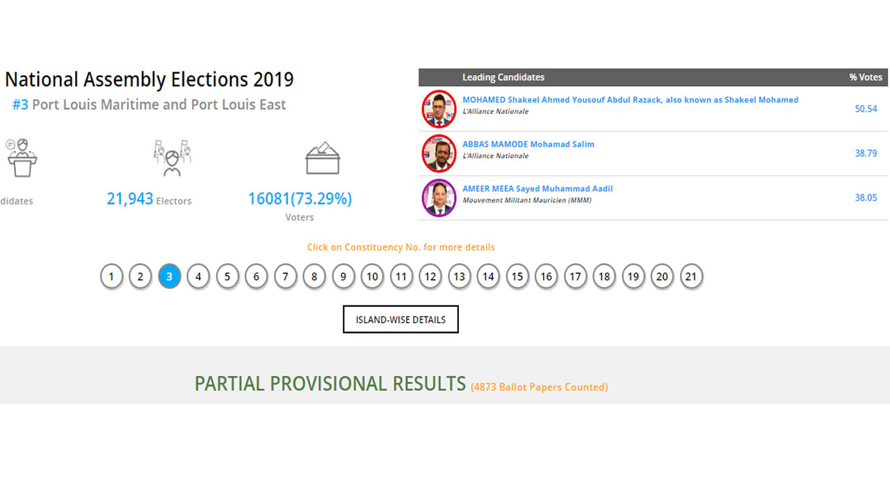 C’est Shakeel Mohamed candidat de l’Alliance Nationale (Ptr-PMSD-Mouvement Jean-Claude Barbier) qui est en tête après le premier pointage dans la circonscription no 3 (Port-Louis-Est/Port-Louis-Maritime) avec 50,54 % des votes.