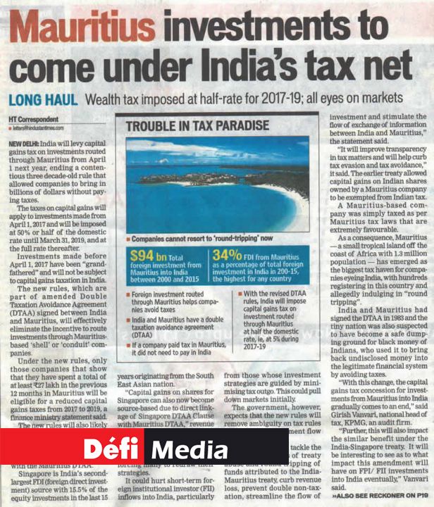 Le secteur, qui a comme noyau les transactions avec le marché indien, se taille la part du lion de ces 50 % des activités offshore. En sus des compagnies de gestion qui dépendent de l’offshore, on retrouve des cabinets d’avocats, des firmes d’experts-comptables et des entreprises qui s’occupent du back-office. Ces emplois sont très rémunérateurs. Qui dit salaires élevés dit plus de revenus sous formes de taxes pour le gouvernement mauricien. L’argent trace son chemin dans toutes les sphères de l’économie. Quelles sont ces clauses du traité qui affecteront de manière drastique notre offshore ? D’abord, l’Inde sera en mesure de taxer les gains sur les investissements à partir d’avril 2017. Ces nouvelles mesures fiscales seront en vigueur à 100 % dès l’année financière 2019-20. Or, les fonds basés à Maurice ont été épargnés jusqu’ici. Qui plus est, les intérêts que perçoivent les banques sur des prêts indiens seront taxés à 7,5 %. Avec l’entrée en vigueur des nouvelles dispositions du traité, le pays risque d’assister à un départ massif des compagnies offshore qui ont bénéficié de l’ancien. Elles casseraient le rythme de croissance soutenue dans la création de nouvelles sociétés. De décembre 2015 à fin février 2016, le pays a enregistré 210 nouvelles sociétés offshore pouvant bénéficier de toutes les clauses d’un traité. L’annonce des nouvelles clauses coïncide avec celle portant sur une subvention de Rs 12,7 milliards que l’Inde a accordée au pays. Cet argent servira à financer quatre projets, dont Heritage City, la nouvelle capitale administrative de Maurice. Et Rama Sithanen estime que cette enveloppe est accordée pour compenser les pertes à la suite de ce nouvel accord. « Je n’aurais jamais cru qu’on braderait un secteur aussi important que l’offshore pour si peu d’argent et investir dans des projets spéculatifs et immobiliers », a fait ressortir Rama Sithanen sur les ondes de Radio Plus, le mercredi 11 mai. « Je suis triste pour mon pays. Je pense qu’il y avait d’autres solutions et que le secteur offshore vaut plus que 350 millions de dollars. (…) » Et d’ajouter : « Voilà. C’est terminé. Nous devons subir les conséquences. Si l’accord était un bon deal, pourquoi l’Inde nous a-t-elle accordé une compensation ? C’est un très mauvais choix stratégique. Nous avons sacrifié un des pans de notre économie mauricienne pour que nous puissions investir dans le béton, pour que nous puissions investir dans Heritage City. » [[{"type":"media","view_mode":"media_large","fid":"16909","attributes":{"class":"media-image aligncenter size-full wp-image-28604","typeof":"foaf:Image","style":"","width":"800","height":"935","alt":"Accord fiscal transitoire avec l\u2019Inde"}}]] [row custom_class=""][/row]Roshi Bhadain: « L’accord profitera à toute la population »