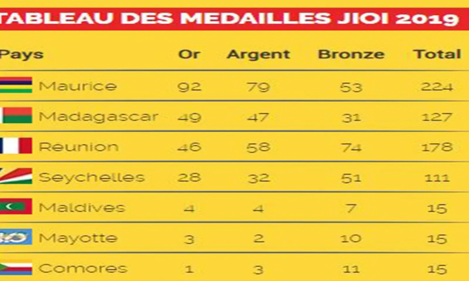 Maurice termine largement en tête au tableau des médailles. Avec 92 médailles d’or, 79 médailles en argent et 53 médailles en argent, notre pays boucle cette dernière journée des Jeux avec 224 médailles au compteur. Madagascar est second avec un total de 127 médailles (49 médailles en or, 47 médailles en argent et 31 médailles en bronze). La Réunion termine troisième du podium avec 178 médailles (46 médailles en or, 48 médailles en argent et 74 médailles en bronze).