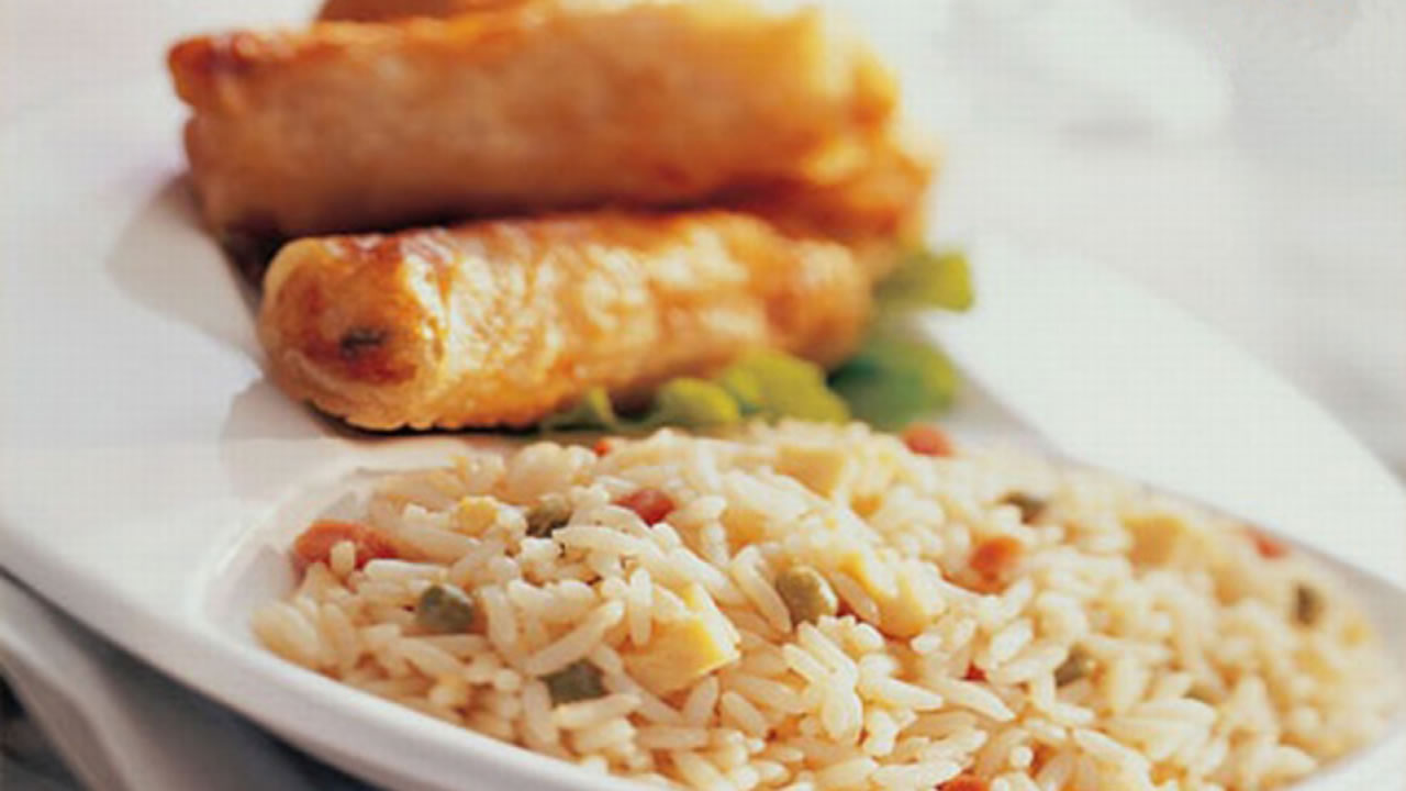 - Versez le riz dans des bols, puis ajoutez les nems par-dessus.