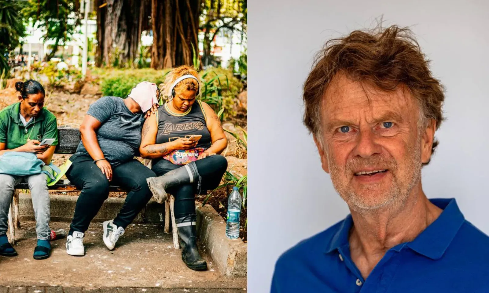 Sur la photo sélectionnée, on voit trois femmes assises sur un banc. L’une porte des bottes et est absorbée par son téléphone. La deuxième a la tête posée sur l’épaule de la première, le visage à moitié caché. La troisième, sans bottes, est également concentrée sur son téléphone. La scène a été capturée à midi, le 2 octobre 2024, par une chaude journée humide, tandis que la lumière du soleil filtrait à travers les feuilles d’un grand arbre. Il a montré sa photo à l’une des femmes figurant sur l’image, celle située à gauche. Elle l’a accueillie avec un sourire.