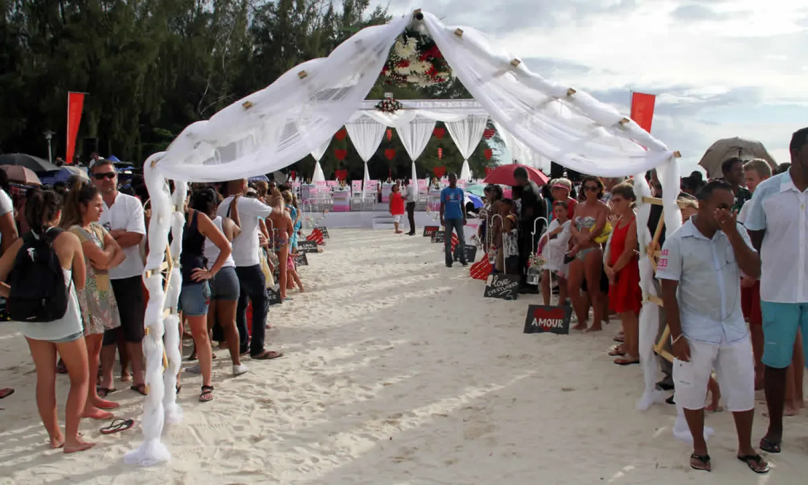 Les couleurs de l’amour ornent la plage de Flic-en-Flac. Radio Plus a concrétisé le rêve de 14 couples en leur offrant la possibilité de se marier civilement sur le sable ivoire au coucher du soleil lundi.
