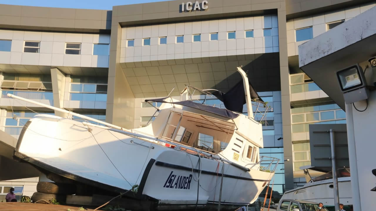 L’Islander, l’un des trois bateaux de la famille Gurroby, domiciliée à Grand-Baie, repose, ce vendredi 7 mai, dans l’enceinte du bâtiment de l'Independent Commission against Corruption, à Réduit. Ces trois bateaux ont été saisis dans le cadre de l’enquête sur la saisie record de drogue estimée à Rs 3,7 milliards à Pointe-aux-Canonniers, dimanche 2 mai.