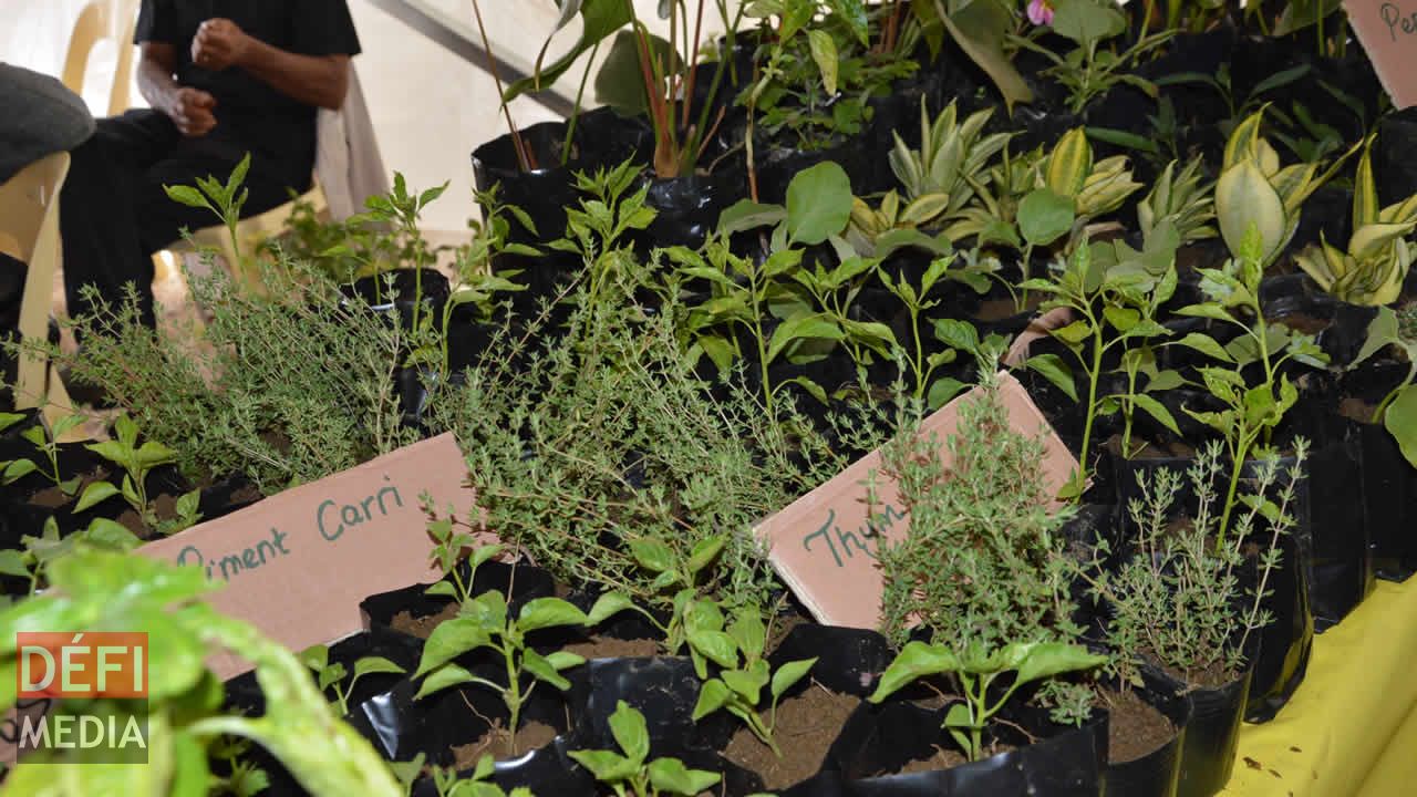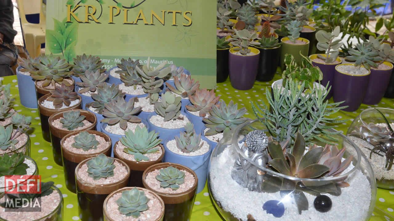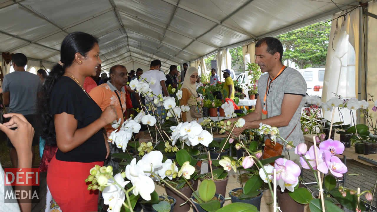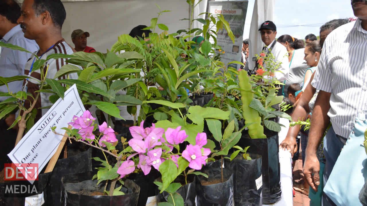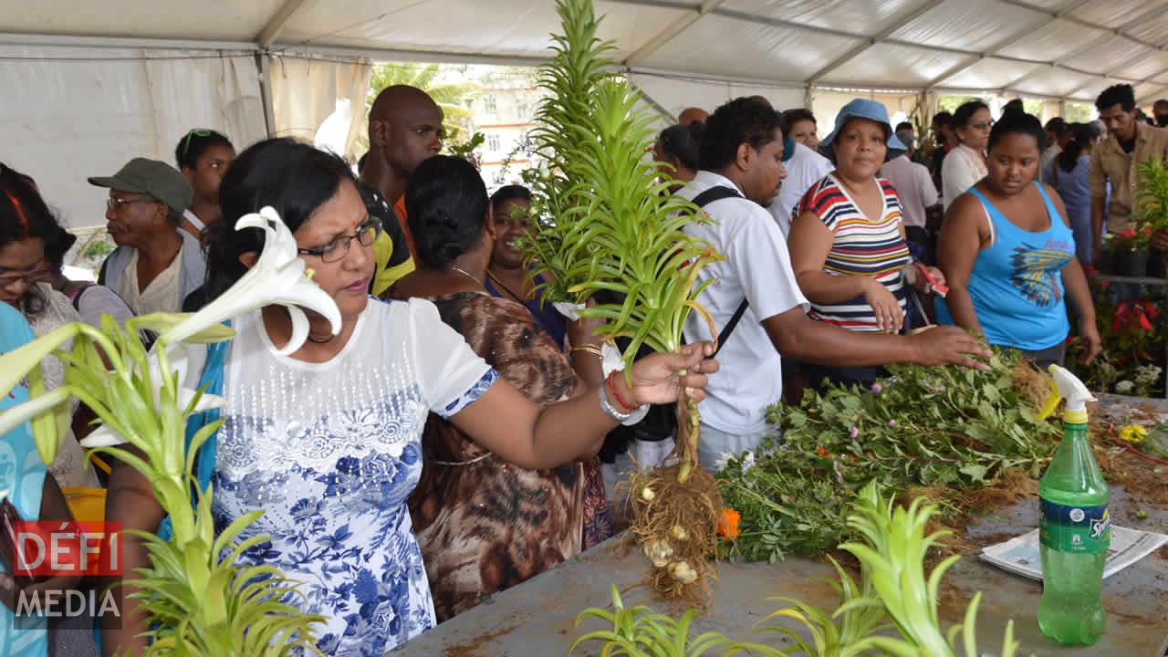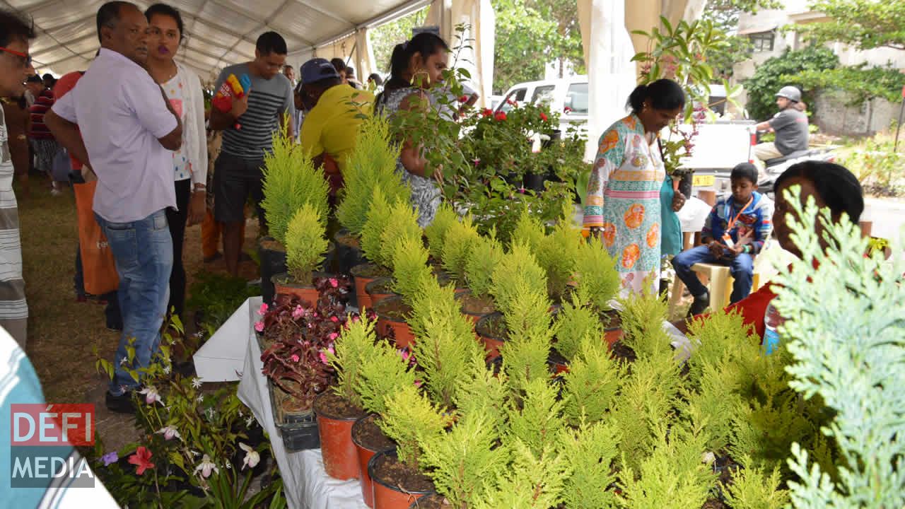 Les couleurs vives des fleurs dans la section Agriculture attirent les regards. Kamlesh Oogur et sa mère Padmaoty achètent deux arbres à pain.