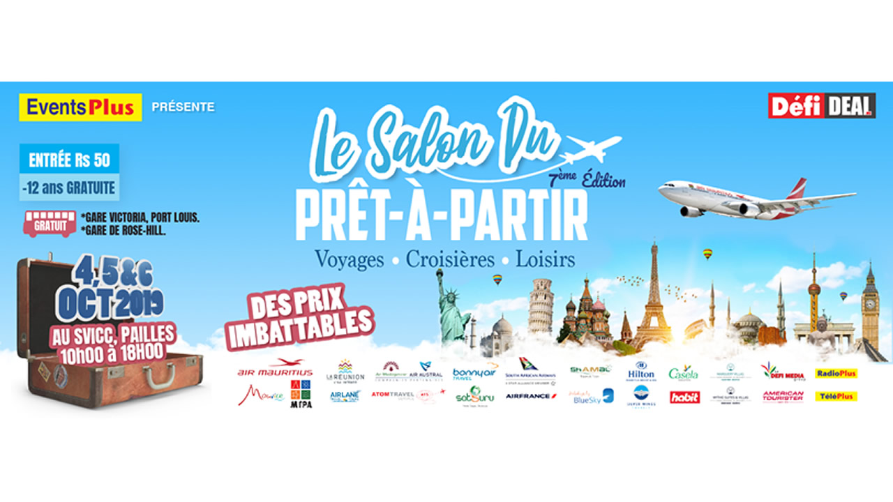 Des offres alléchantes sur les billets d'avion, de croisières, des hôtels et autres activités ! Cela se passera lors de la 7e édition du Salon du Prêt-à-Partir du 4 au 6 octobre 2019 au centre de conférence Swami Vivekananda à Pailles. Cet évènement est présenté par Events Plus avec la collaboration du Défi Deal, du Défi Media Group et Radio Plus et pour partenaire principal Air Mauritius.