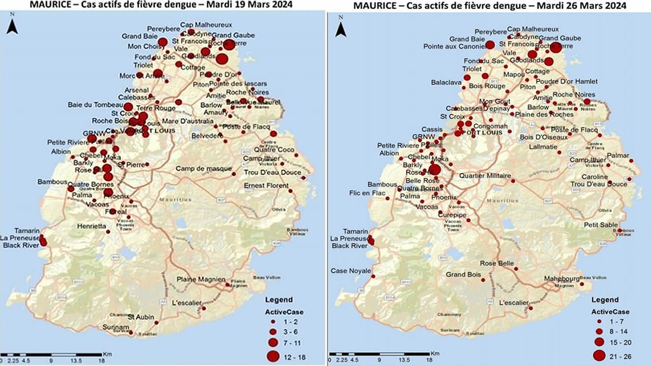 De nombreux cas de dengue sont toujours enregistrés après une « baisse » du nombre de cas actifs observée du 1er au 19 mars. De nouveaux foyers semblent également avoir été identifiés, ainsi qu’une nouvelle tendance à la hausse depuis ces quelques jours. La situation risque de s’aggraver avec le mauvais temps dans le sillage de la forte tempête tropicale Gamane au cours du week-end du 30 et 31 mars, selon le Dr Shameem Jaumdally.