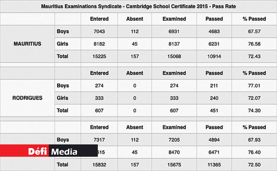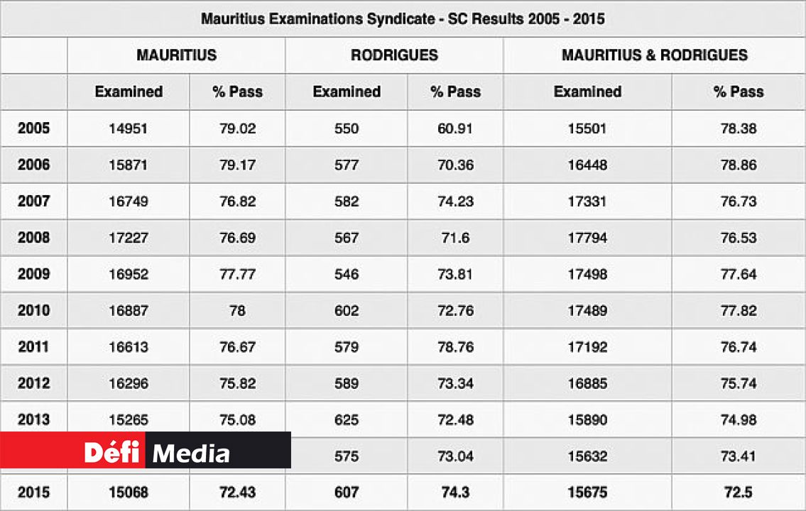 In a press conference on the same day, the Mauritius Examination Syndicate (MES) revealed that the pass rate for the SC for year 2015 is of 72,5%. However, a decline was noted compared to 2014 where the pass rate was of 73,4% – that is a decline of 0,91%. In addition to this, performance in core subjects like English has also dropped.