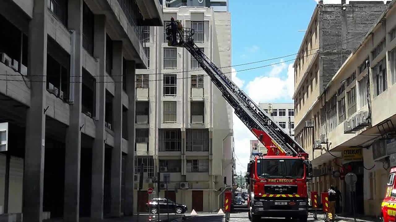 C'est une scène quelque peu insolite qui s'est jouée dans le centre-ville de Port-Louis, ce mercredi 1er février 2017. La grande échelle des pompiers a dû être mise à contribution pour nettoyer le bâtiment Emmanuel Anquetil à grande eau.
