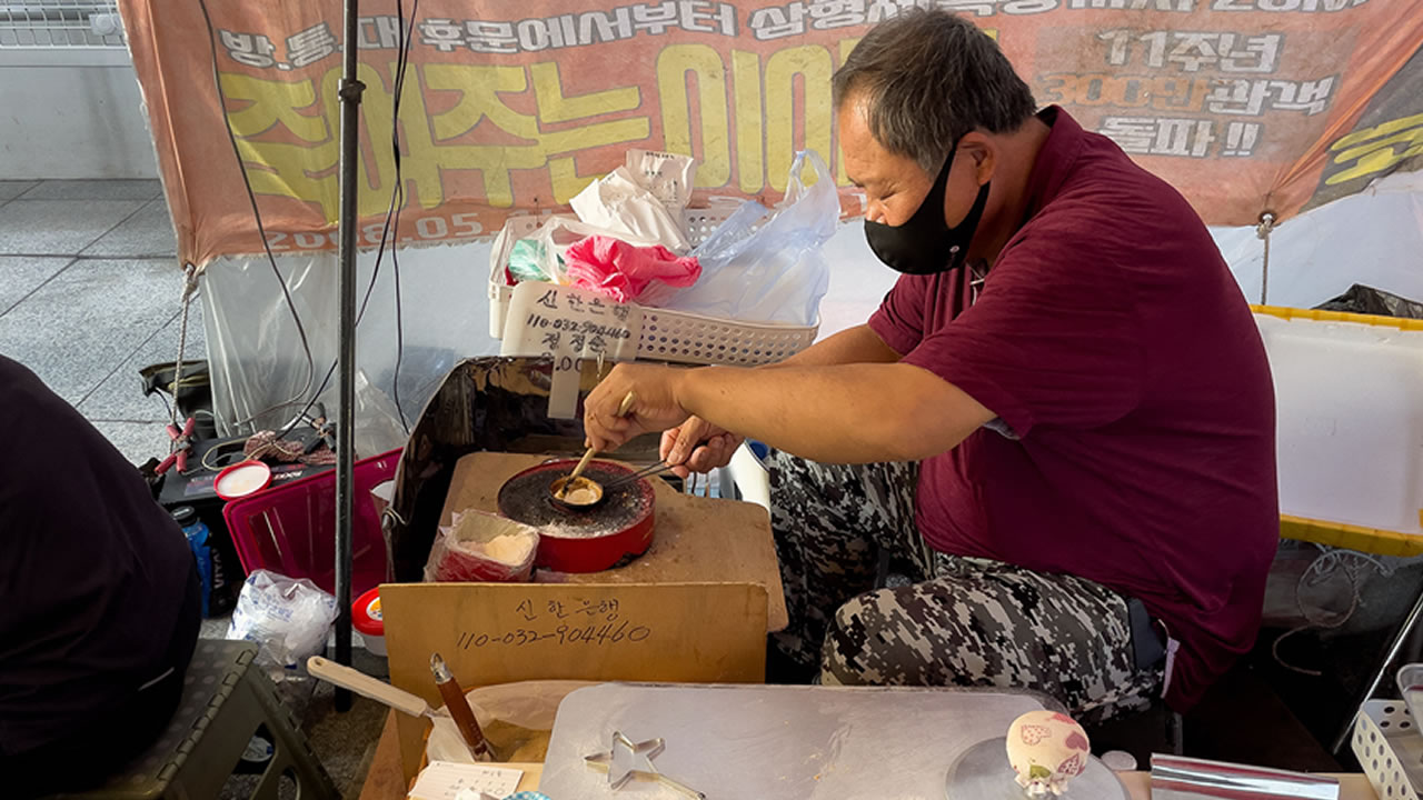 Il faut environ 90 secondes à M. Lim pour fait fondre du sucre et du bicarbonate dans une petit louche au-dessus d'un brûleur. Puis, il presse la pâte et, à l'aide d'un moule, il donne la forme souhaitée par le client.