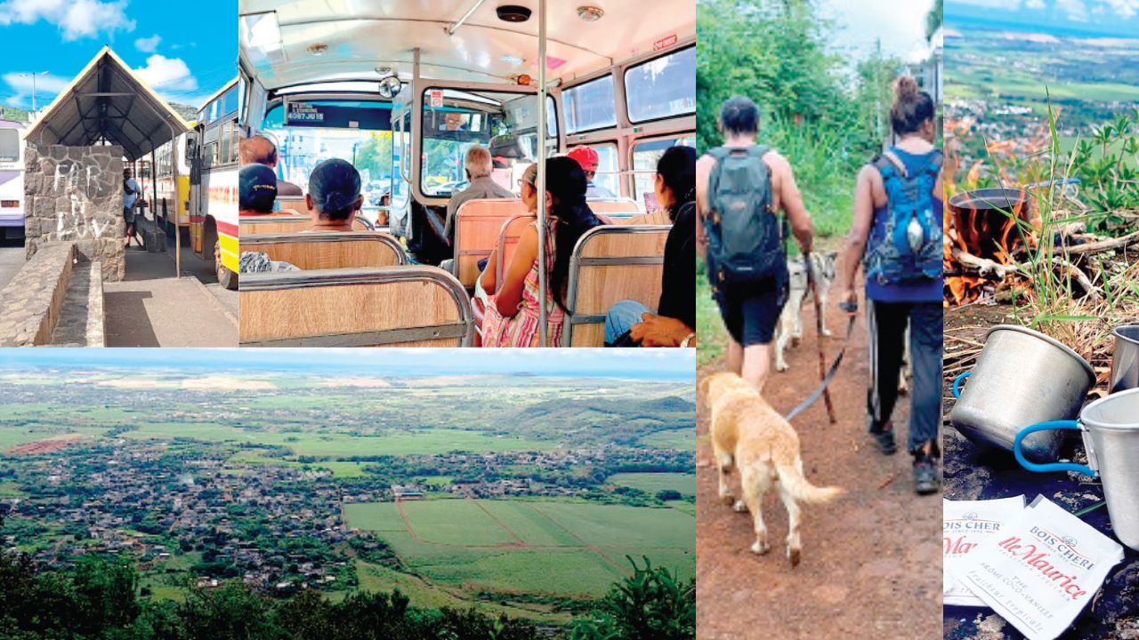 Assis près du feu en tenant notre tasse de thé brûlant, nous caressons Neptune tout en admirant la vue. Des pailles en queue virevoltent dans le ciel. Face à ce paysage époustouflant, chaque gorgée de thé devient une expérience sensorielle, une communion avec la nature. Cette sérénité remplit notre coeur de bonheur. Les tasses vidées et toutes les braises de notre petit feu soigneusement éteintes, nous passons à l’ascension du sommet de la Montagne Longue avec nos compagnons à fourrure. Au pic, la montagne du Petit Morne se dessine d’un côté et la rade de Port-Louis se révèle de l’autre, entre les feuilles de plantes gigantesques. Nous admirons les nuages et la verdure des montagnes. Avec le doigt, nous testons nos connaissances sur les noms des montagnes vues d’ici, telles que Le Pouce, Pieter Both, Virgin Peak, Cantin Peak et Mont Jacob parmi tant d’autres.