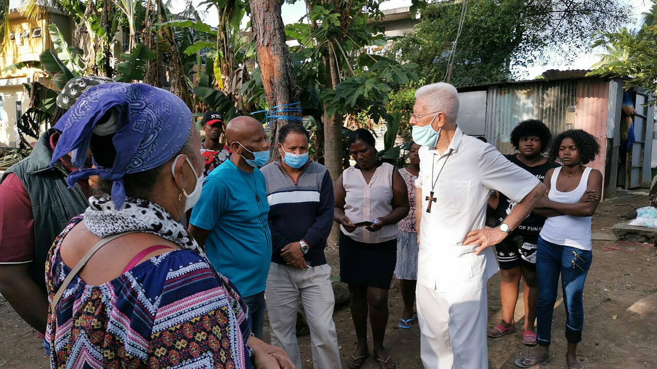 Le cardinal Maurice Piat a rendu visite aux squatters de Riambel, ce dimanche après-midi 14 juin. Ces derniers, n’ayant nul part où aller, sont installés aux abords de la plage de la localité.