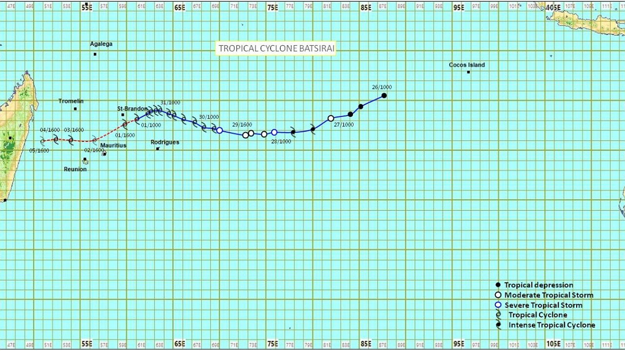 « À 10 heures, le cyclone tropical Batsirai était centré à environ 175 km à l’est-sud-est de St-Brandon, à 16,9 degrés de latitude sud et 61,1 degrés de longitude est. La pression centrale estimée du cyclone tropical est d’environ 965 hectopascals et la rafale de vent estimée près du centre est d’environ 200 km/h », indique-t-on dans le bulletin.