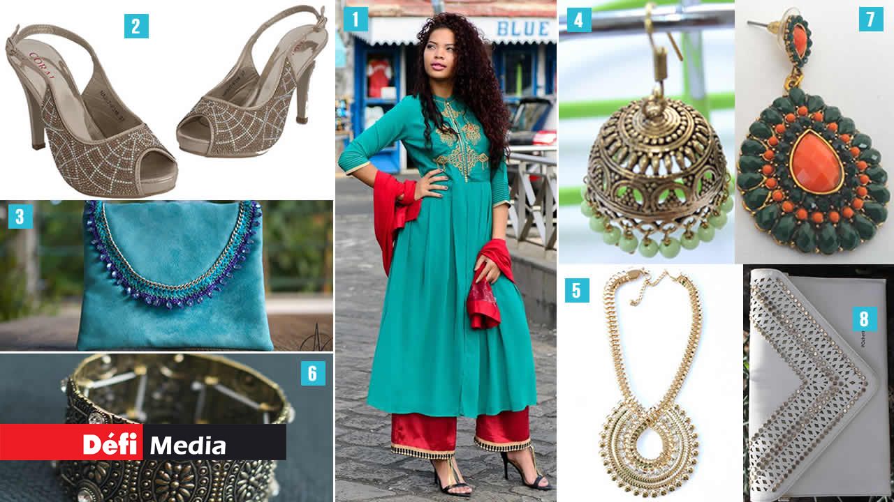 Vous ne passerez pas inaperçue dans ce magnifique trois-pièces rouge et vert. Le kurti vert orné de doré est en vente à Rs 2 099, le pantalon à Rs 3 699 et le duppata à Rs 899. Ces items sont disponibles au magasin W, à Port-Louis et Trianon.