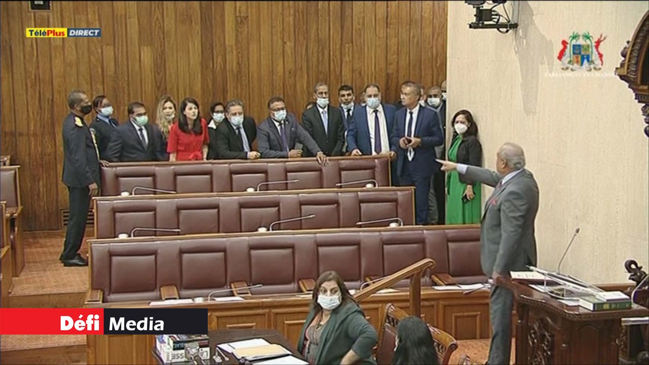La députée mauve, Joanna Bérenger, a alors qualifié de « lâche » le Speaker. Sooroojdev Phokeer l'a « named ». L'opposition a quitté la salle en signe de protestation. La séance a été suspendue.
