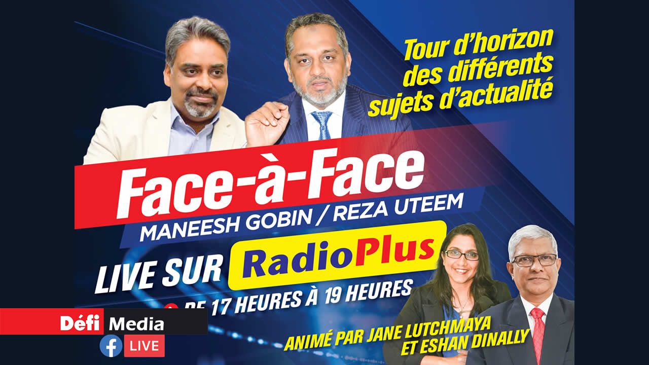 Radio Plus vous propose un face-à-face Maneesh Gobin/Reza Uteem ce mercredi. L'Attorney General et le député du MMM répondront aux questions de Jane Lutchmaya et d'Eshan Dinally sur différents sujets d'actualité.