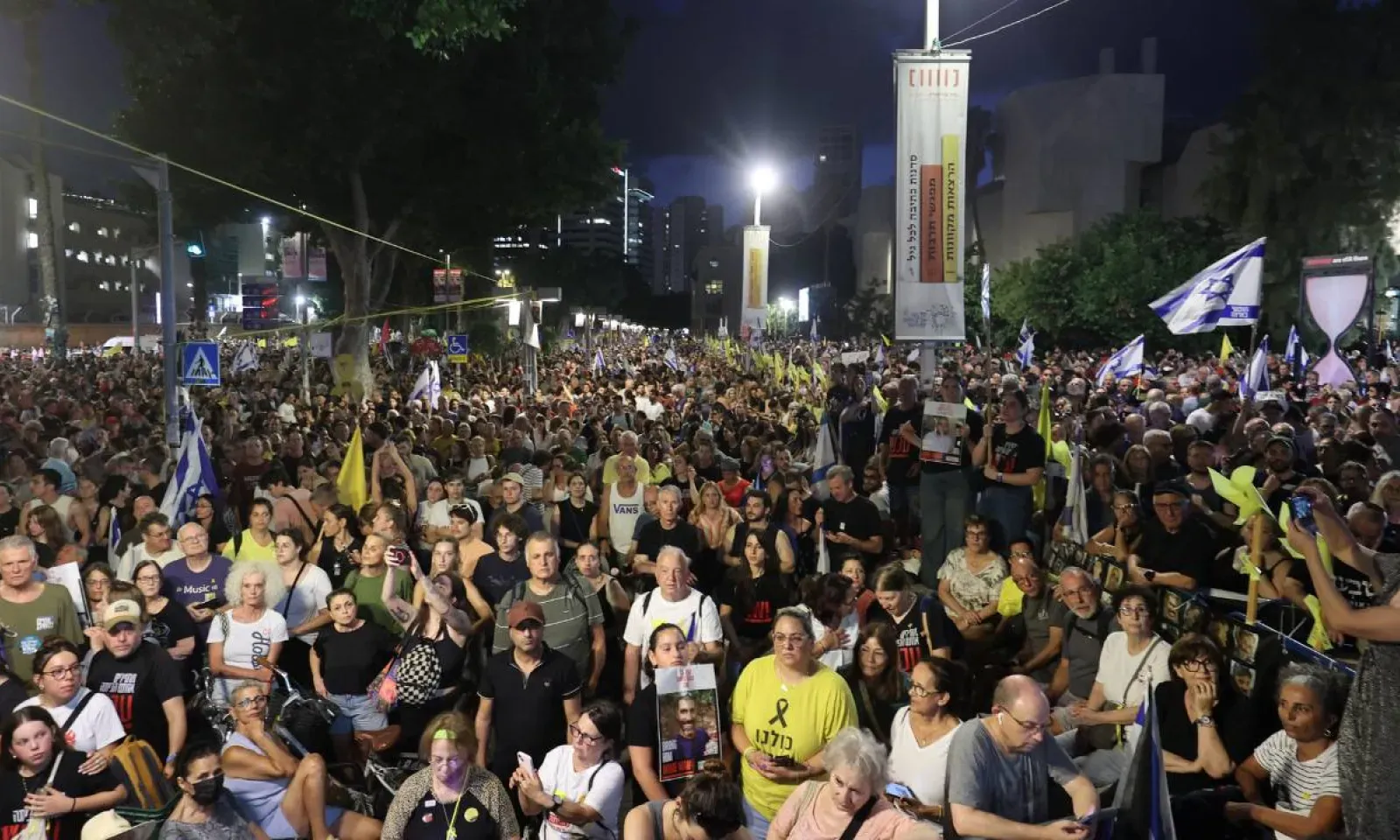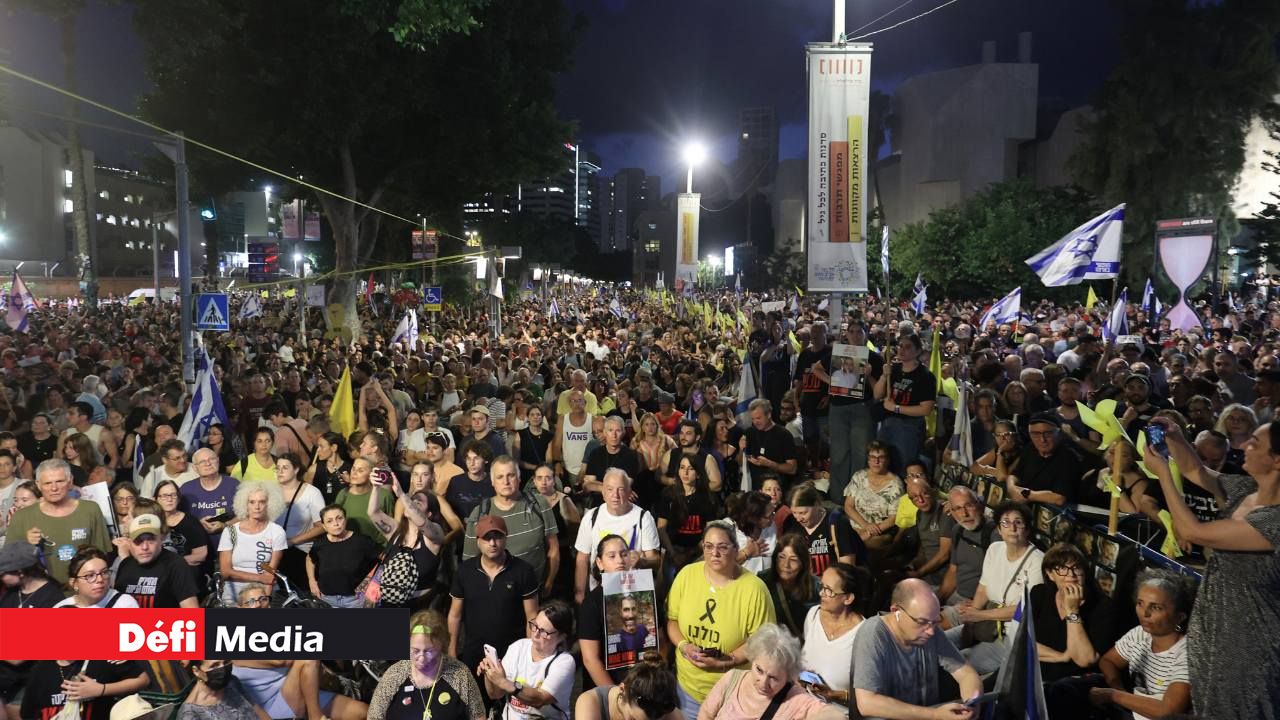 Brandissant des photos d'otages, aux sons de tambours et slogans appelant au retour des captifs israéliens, des dizaines de milliers de personnes, jusqu'à 500 000 selon les organisateurs, ont pris les rues Tel-Aviv dimanche pour demander la fin de la guerre à Gaza.
