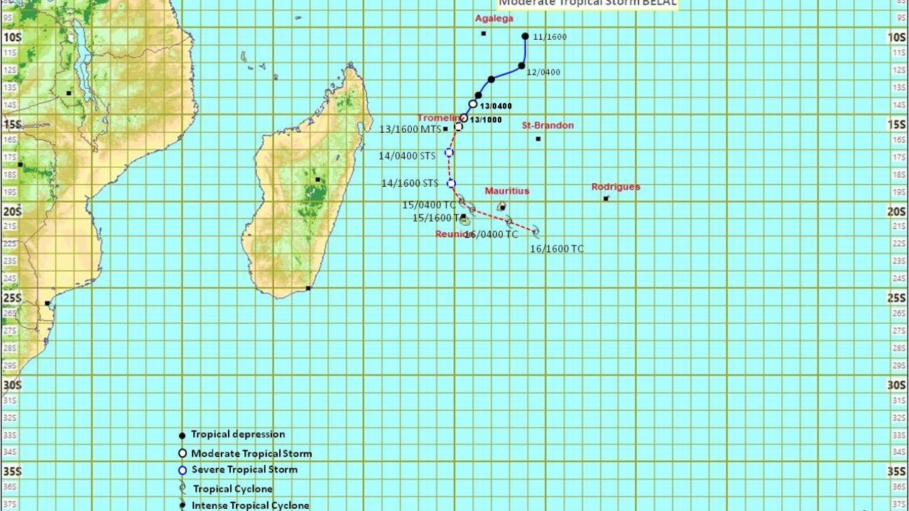 À 16 h, la tempête tropicale modérée Belal était centrée à environ 520 km au nord-nord-ouest de Maurice. Elle se déplace maintenant vers le sud-ouest. L'alerte cyclonique de classe 1 est maintenue. La station météorologique a revu ses prévisions de trajectoire. Si dans un premier temps, elle privilégiait une trajectoire directe sur Maurice, elle est maintenant d'avis que Belal passera plus près de La Réunion. C'est du moins ce que le service météo indique sur sa carte de prévisions de trajectoire, mise à jour à 16 h ce samedi.