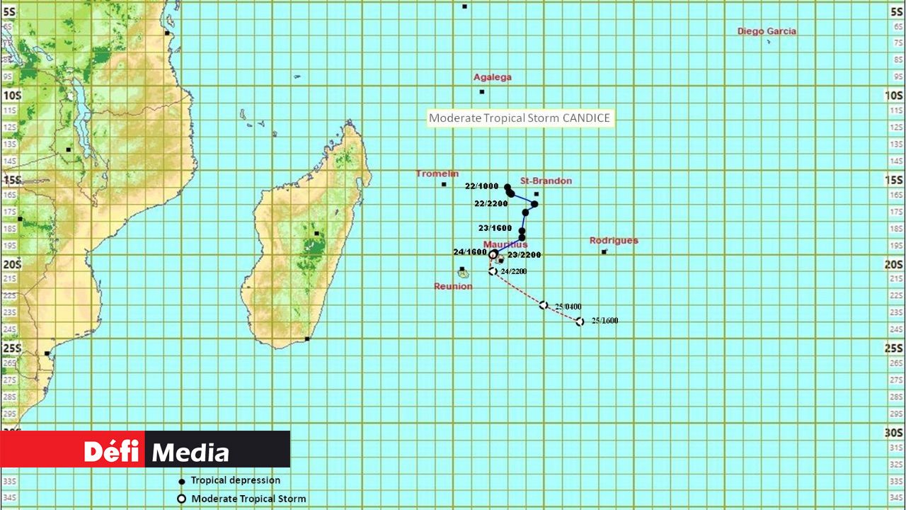 À 22 h, la tempête tropicale modérée Candice se trouvait à environ 50 km à l'est-nord-est de Grand-Gaube, près de la latitude 19,8 degrés sud et de la longitude 58,1 degrés est.