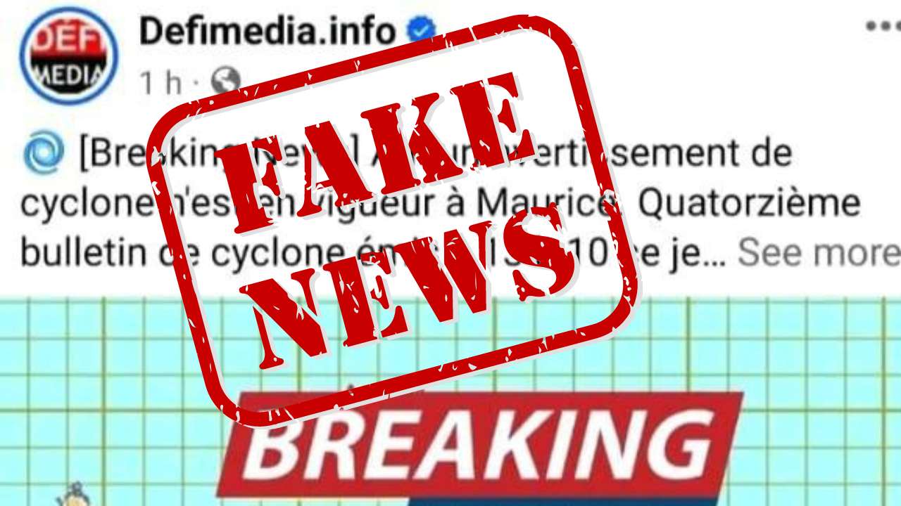 Une "Fake News" intitulée « Breaking News : Aucun avertissement de cyclone n’est en vigueur à Maurice… » circule sur les réseaux sociaux avec le logo du Défi Media Group. Cette fausse nouvelle ne provient d'aucune de nos plateformes. Nous n'avons jamais publié un tel article.