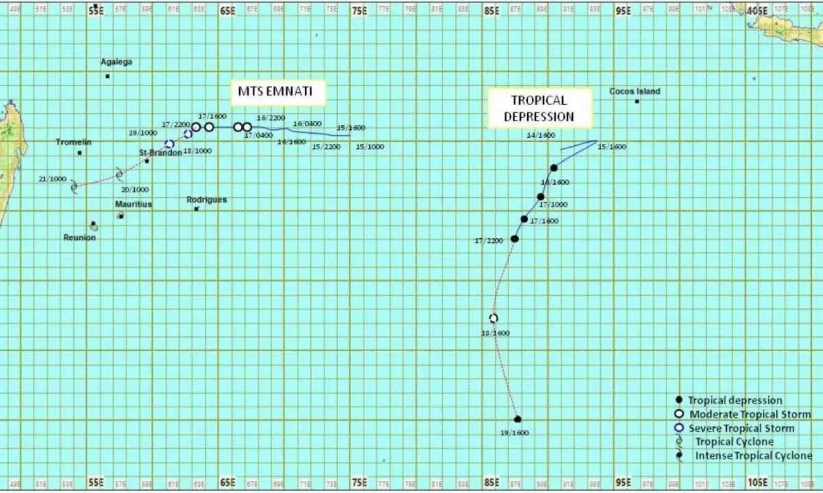 À 22 heures, la tempête tropicale moderée Emnati était centrée à environ 630 km au nord de Rodrigues, dans un rayon de 30 km autour du point 14,0 degrés sud en latitude et 63,3 degrés est en longitude. Elle se déplace dans une direction générale de l'ouest à une vitesse accélérée d'environ 22 km/h.