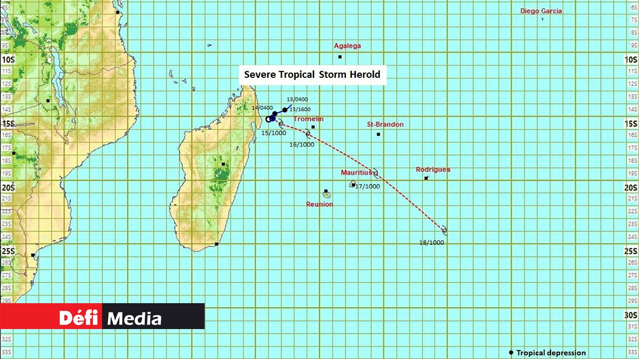 «Son mouvement est encore indéfini. Cependant, il est prévu qu'il se déplace dans une direction générale de l'est sud est tout en s'intensifiant davantage. Sur cette trajectoire, Herold pourrait représenter une menace potentielle pour l'île Maurice à partir de lundi soir», prévient la station météorologique de Vacoas dans son deuxième bulletin de cyclone émis à 10h10.