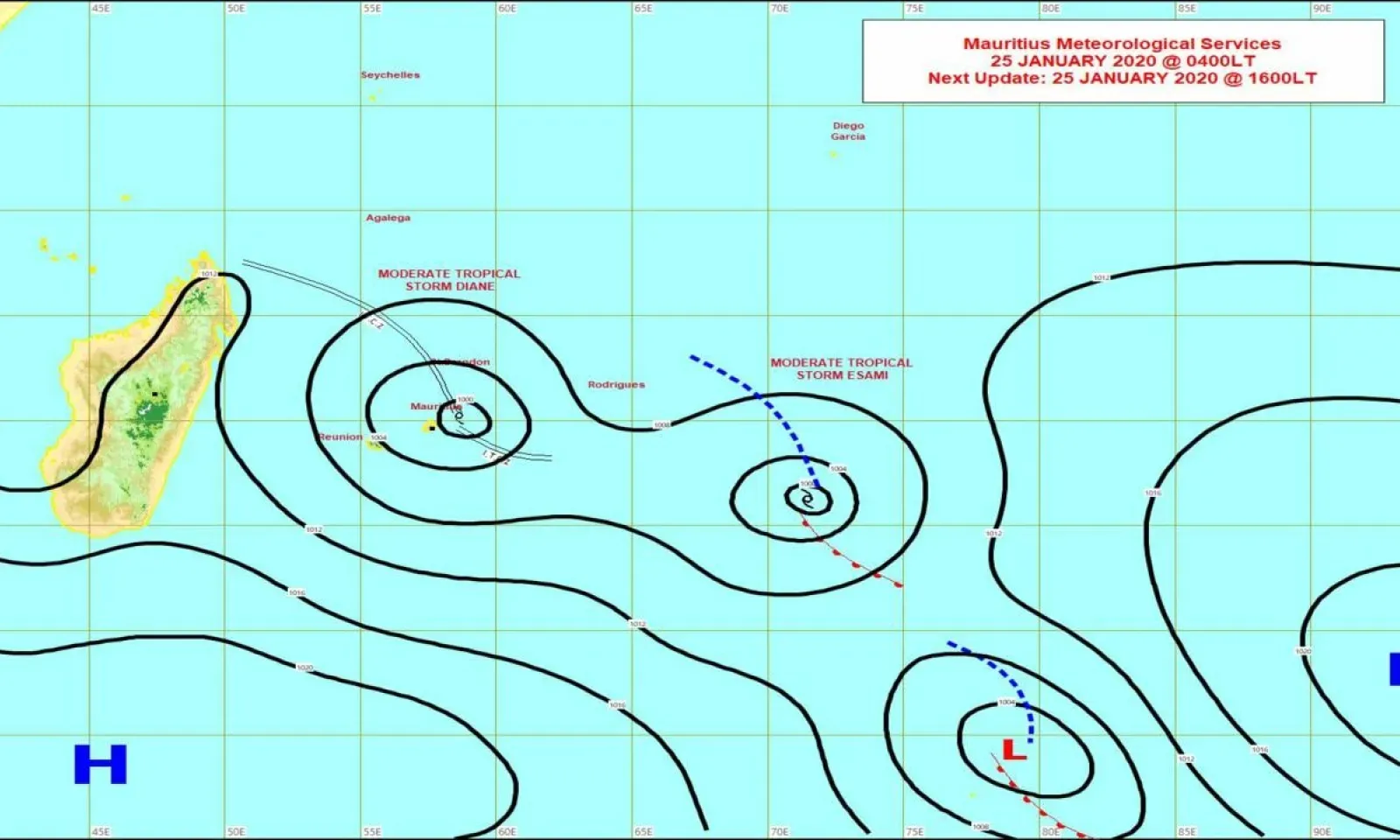 La tempête tropicale Diane s'éloigne de Maurice et se rapproche désormais de Rodrigues. L'alerte cyclonique a été ainsi levée à 04h10 ce matin alors qu'un avertissement de cyclone de classe 1 est toujours en vigueur à Rodrigues. Une autre tempête tropicale modérée évolue à l'est-sud-est de Rodrigues. Elle a été baptisée Esami par les services météorologiques de Maurice à 04h00 ce matin.