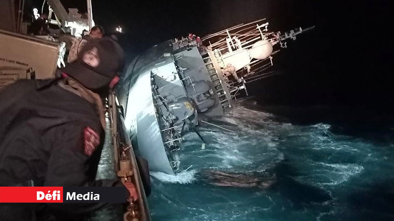Des images diffusées par la marine montrent le navire, totalement penché sur un côté, à moitié englouti par les eaux.