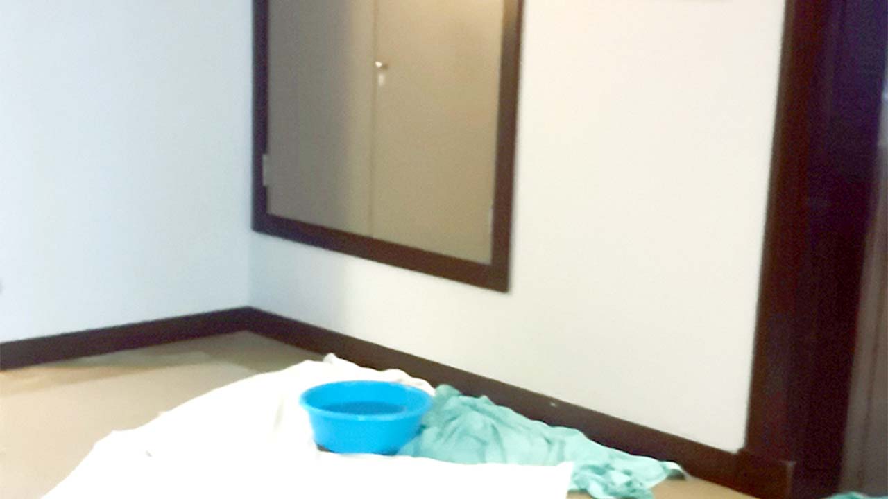 De l’eau s’infiltre dans la toiture d’un hôtel d’affaires de renom, comme le démontre cette photo. Ce qui rend le sol glissant. Pour éviter que les clients ne tombent, les employés ont placé des serviettes, du tissu et même une cuvette pour recueillir l’eau. Une scène qui se joue au vu et au su de tous car cela se passe non loin de la réception de l’hôtel. Niveau accueil, on repassera…