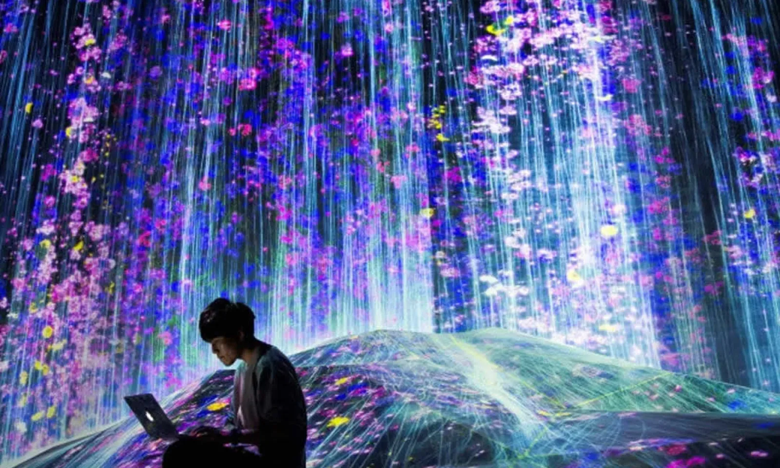 Promenade bucolique au milieu d'une rizière, balade urbaine dans un entrelacs de lampes, plongée dans un océan de vagues, et dégustation d'un vrai thé vert agrémenté d'une fleur virtuelle: au cours de sa déambulation, le visiteur est totalement immergé dans des installations en perpétuel changement.