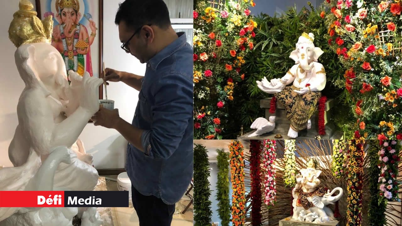 « Je mets la main aux derniers détails de mon murthi. Cette année, il fera plus d’un mètre », dit-il. Spécialisé dans le design, Antish Luximon essaie d’apporter une touche de modernité à la sculpture.