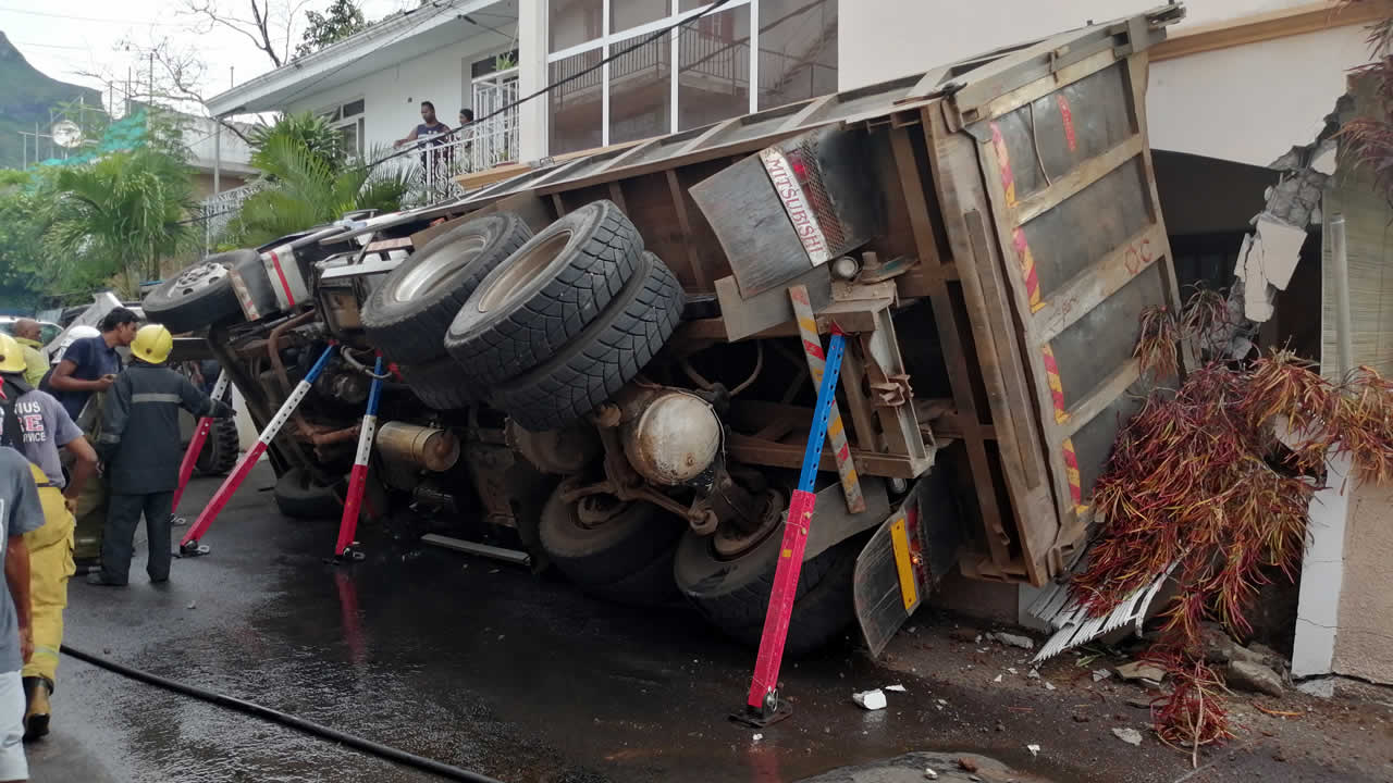 Des policiers du poste de Pope-Hennessy et des pompiers de Port-Louis ont été mandés. Le conducteur du camion, âgé de 48 ans, s’est retrouvé coincé dans l’habitacle. Il y a eu une fuite dans le réservoir du carburant. « Mon époux, notre petit-fils et moi aurions pu mourir dans cet accident. On nous a dit que les freins du camion avaient lâché », explique Marie Josée Attiave.