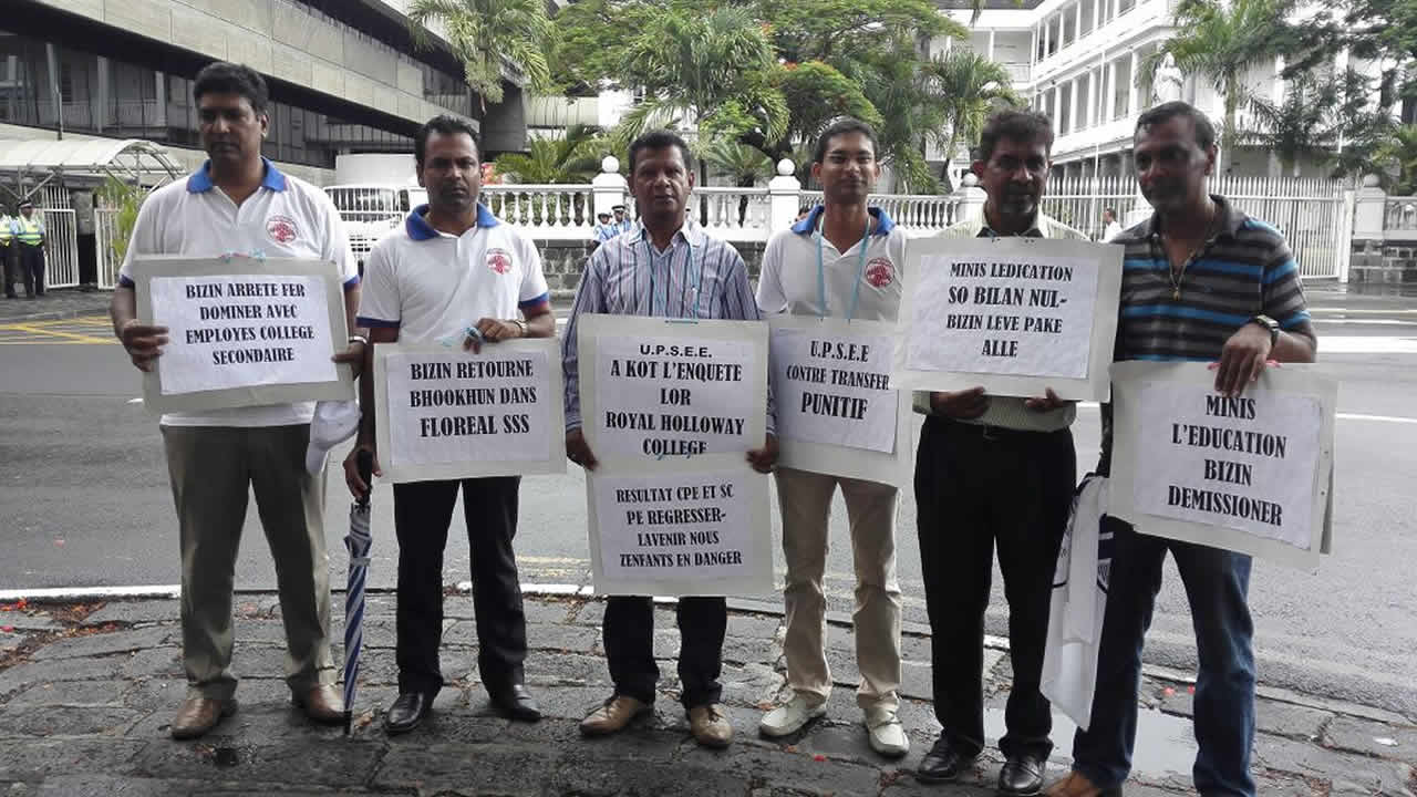 Les membres de l’Union of Private Secondary Education Employees (UPSEE) montent au créneau. C’est leur troisième manifestation en quelques semaines pour dénoncer le transfert qu’ils qualifient de « punitif » de Roshan Bookhun. Cet enseignant d’un collège d’état a été muté dans un établissement à St-Aubin.