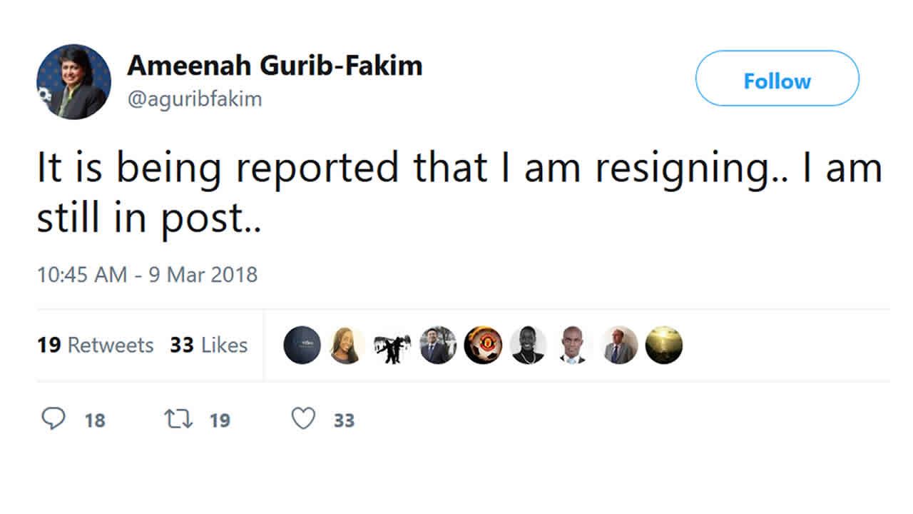 À 22 h 45, la chef d’État a publié sur son compte Twitter : « It is being reported that I am resigning, I am still in post. » Cela n'a pas été son seul tweet. Pour bien démontrer qu’elle n’entend pas se résigner facilement, Ameenah Gurib-Fakim a dit à un autre internaute : « Have not resigned yet. »