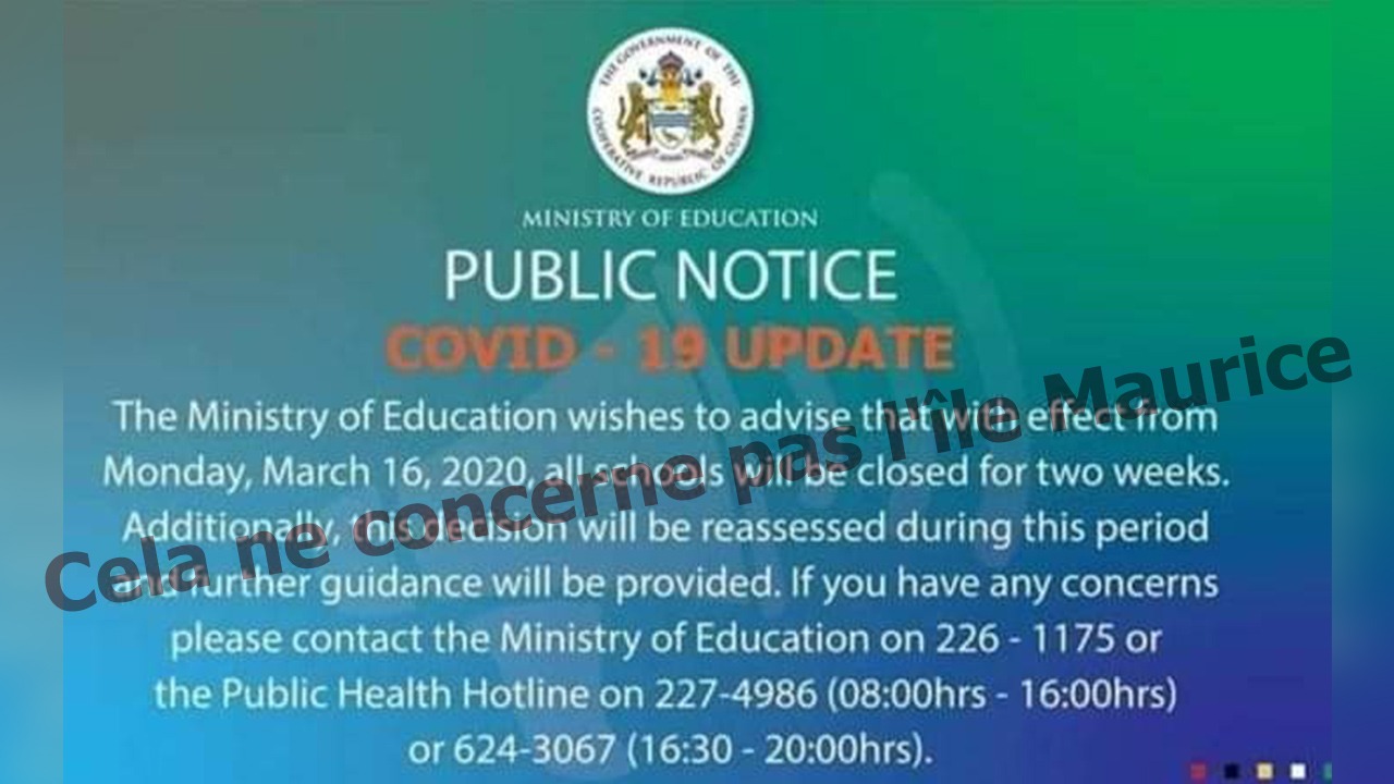 Des internautes nous ont envoyé une photo qui sème la confusion. Il s’agit d’un «communiqué» attribué à tort au ministère de l’Éducation mauricien, faisant état de la fermeture de tous les établissements scolaires à partir du lundi 16 mars. Et ce, pour deux semaines pour cause de Covid-19.