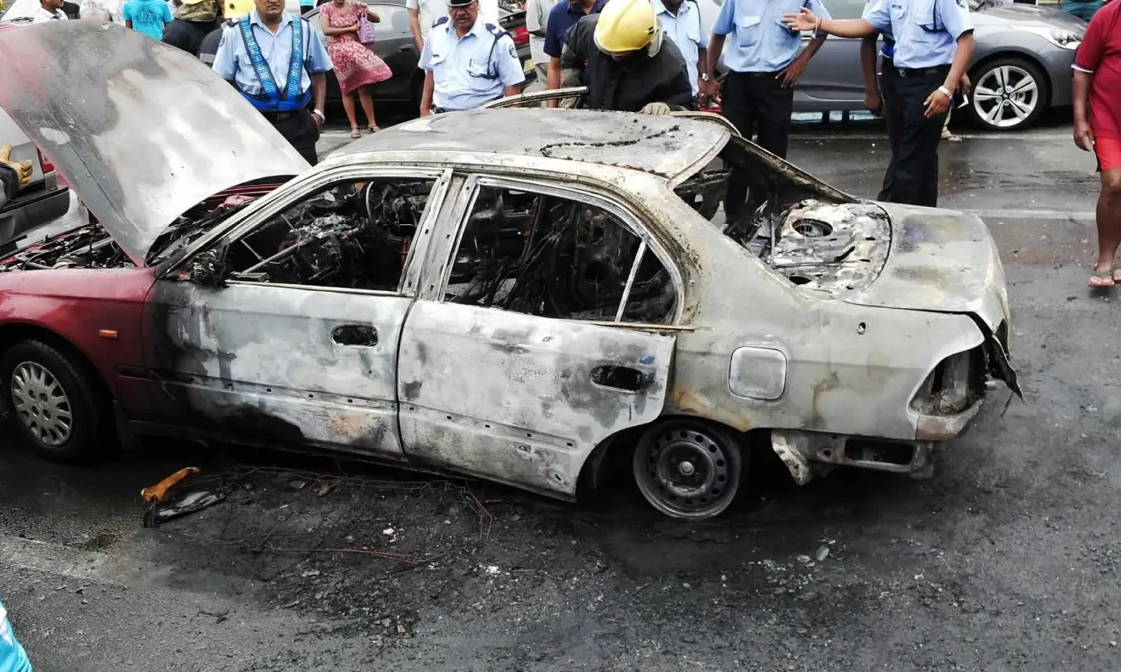 Une voiture rouge de la marque Honda en stationnement à Super U de Grand-Baie a été la proie des flammes, le dimanche matin du 8 novembre.