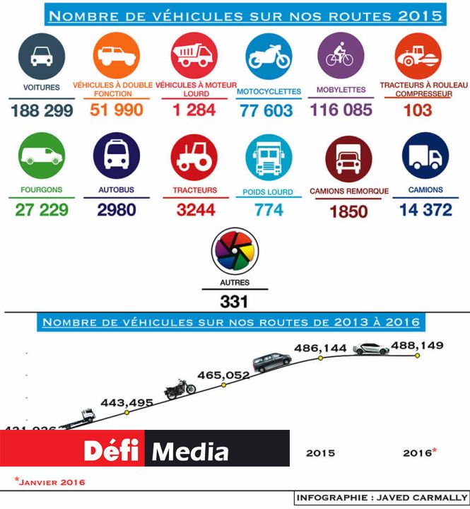 En d’autres termes, l’on compte environ un véhicule pour trois Mauriciens. Ce chiffre tient également compte des véhicules non motorisés (77 603). Il y a 188 299 voitures, 116 085 motos et motocyclettes et 51 990 véhicules utilitaires de type 4x4 et 4x2, entre autres.