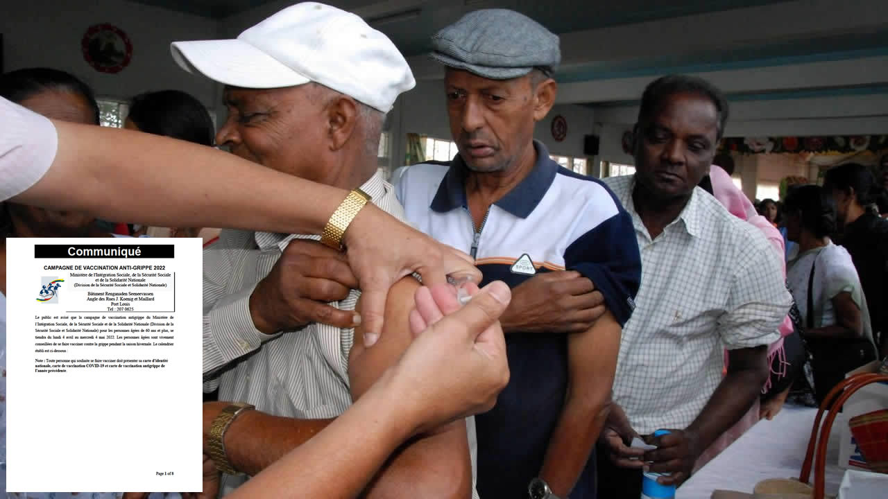 Le public est avisé que la campagne de vaccination antigrippe du ministère de l’Intégration Sociale, de la Sécurité Sociale et de la Solidarité Nationale (Division de la Sécurité Sociale et Solidarité Nationale) pour les personnes, âgées de 60 ans et plus, se tiendra du lundi 4 avril au mercredi 4 mai 2022.