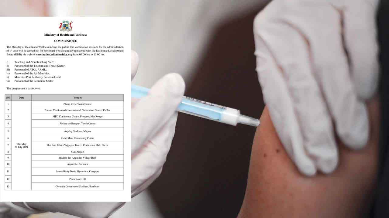 Bonne nouvelle pour des personnes qui se sont enregistrées auprès de l'Economic Development Board via le site internet vaccination.edbmauritius.org pour l’administration de la première dose du vaccin contre la Covid-19. La séance de vaccination débute, demain, jeudi 22 juillet. Les personnes devront se munir de leur carte d’identité.
