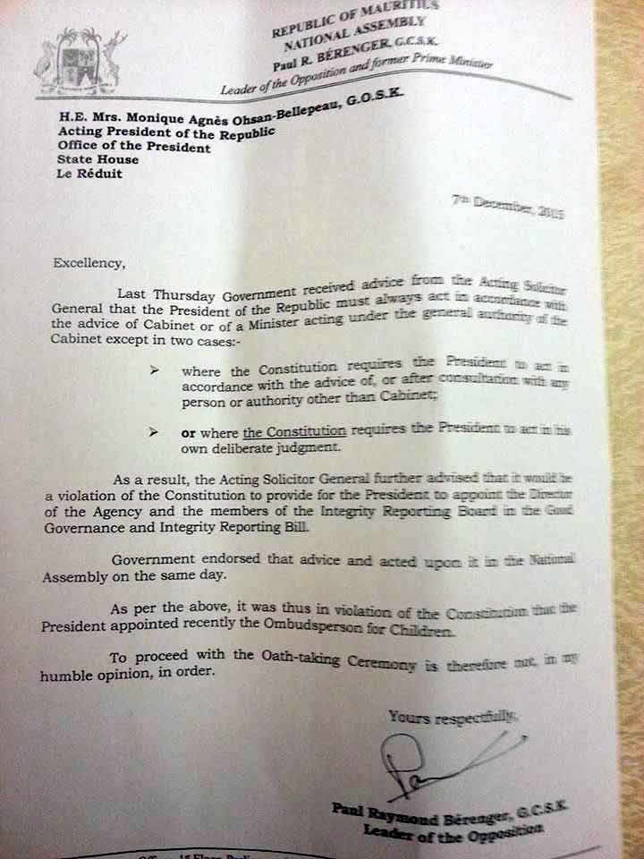 Paul Bérenger envisage de demander une rencontre avec la présidente de la République à ce sujet. En attendant, il a adressé une lettre à la présidente de la République par intérim Monique Ohsan-Bellepeau dans laquelle il estime que la récente nomination de l’Ombudsperson for Children a été faite en violation de la constitution.