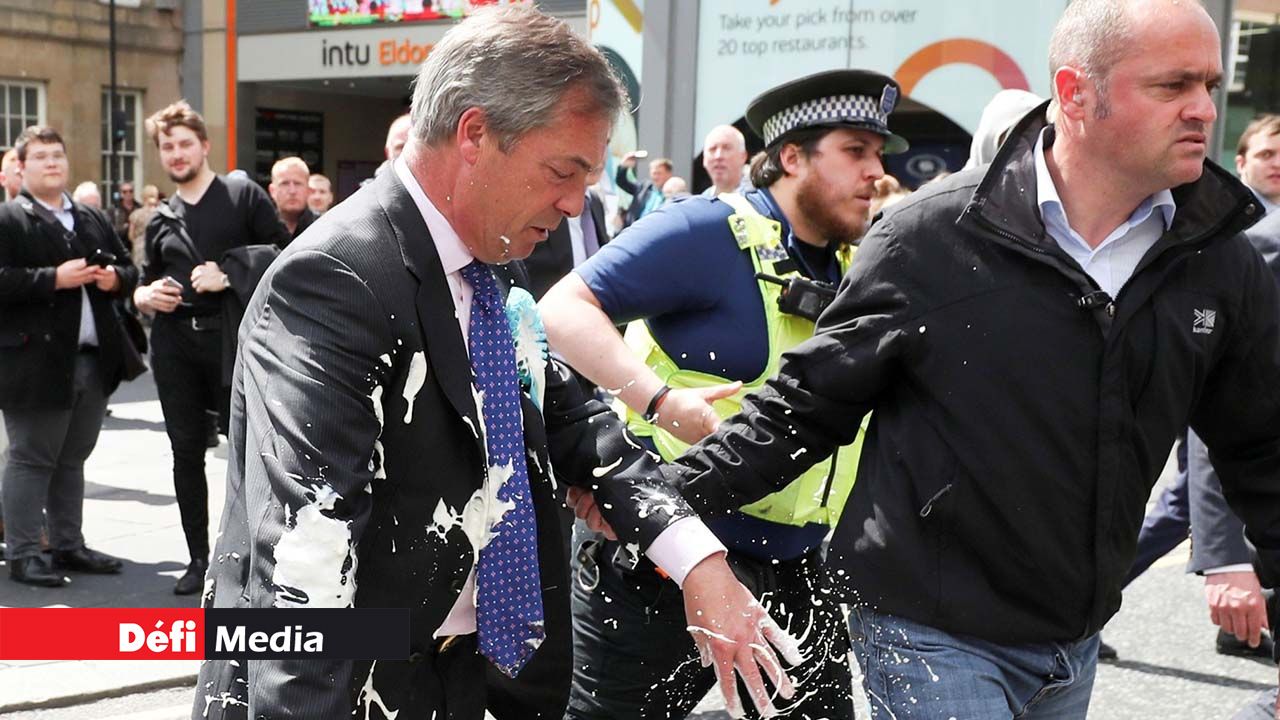 La scène se déroule en plein centre-ville, alors que le candidat marche accompagné de son équipe et de journalistes, selon une vidéo postée sur les réseaux sociaux. Un homme surgit et lance un milk-shake sur M. Farage, avant d'être vivement écarté par un membre de son entourage. «Emmenez (Nigel Farage), ramenez-le à la voiture!» lance ce dernier, tandis que la police intervient pour interpeller l'auteur du lancer.