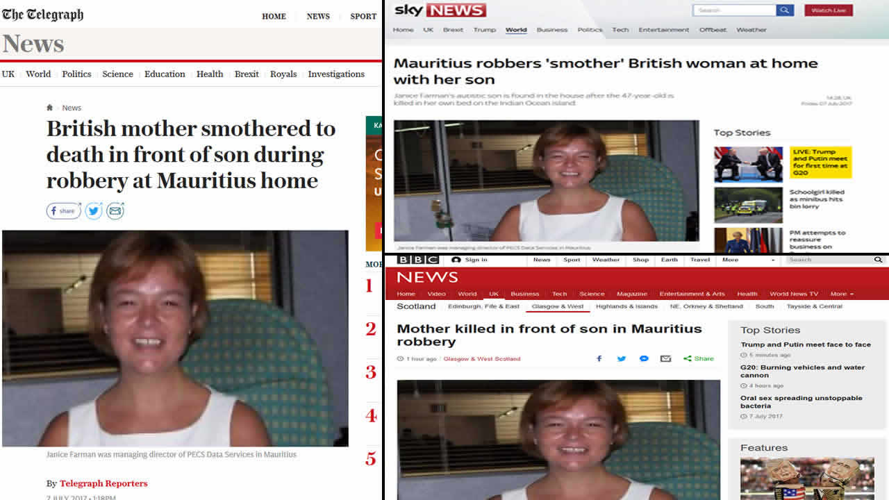 Le site Web de Sky News a, lui, rédigé un article ayant pour titre : «Mauritius robbers 'smother' British woman at home with her son»