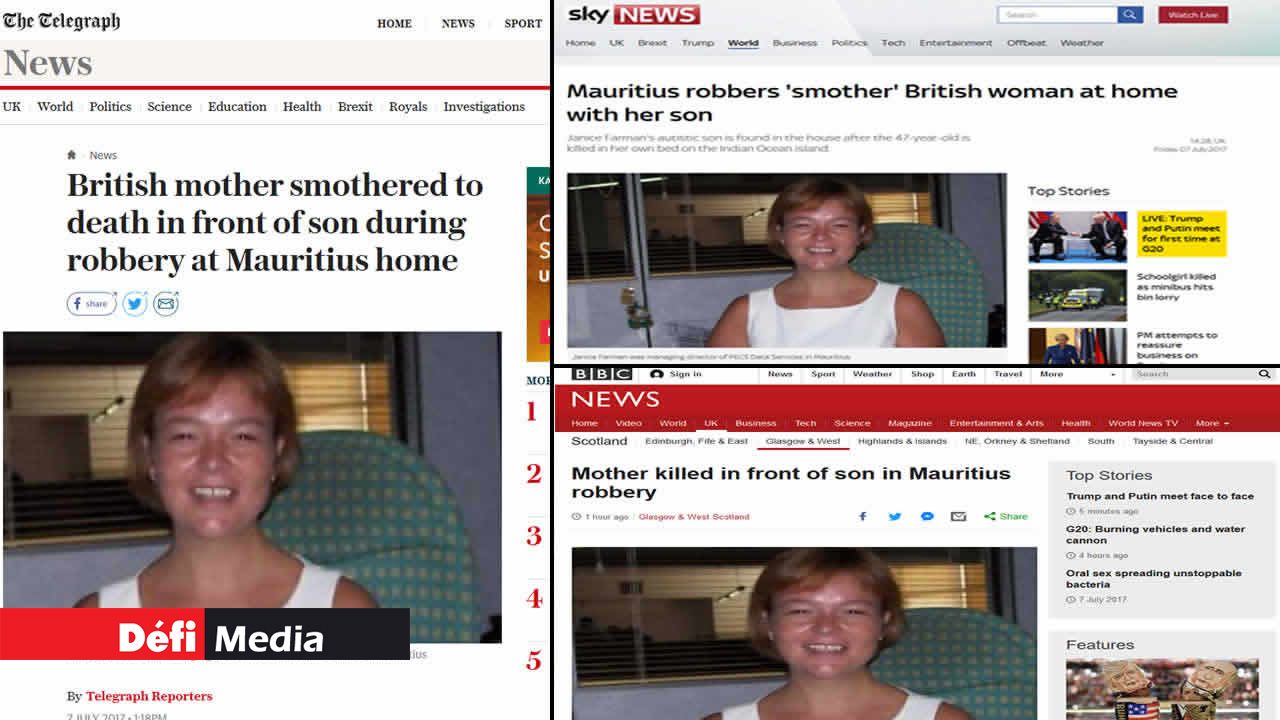 Maurice se retrouve encore une fois dans les médias internationaux pour de mauvaises raisons. Le meurtre de l’Ecossaise Janice Farman, établie au pays depuis 2004, a été largement diffusé dans la presse britannique. Le site Web de la BBC a ainsi titré : «Mother killed in front of son in Mauritius robbery».