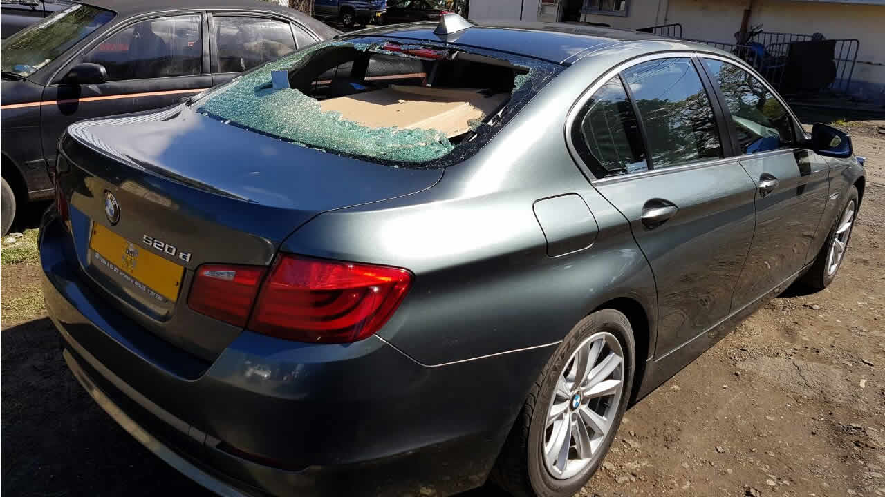 La voiture officielle du maire de Quatre-Bornes Atmaram Sonoo a été endommagée vers 11 heures samedi 14 mai ; le pare-brise a été touché et la vitre arrière a volé en éclats.