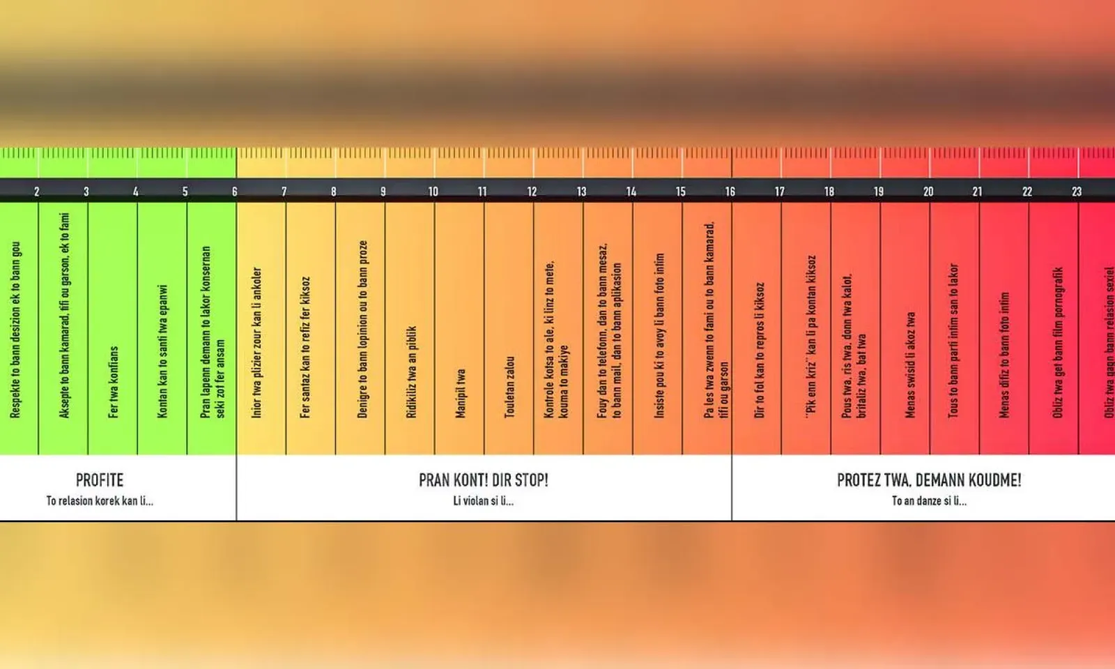 Lancée par la plateforme Stop Violans kont fam, le violentomètre est un outil simple et efficace, qui permet avant tout une auto-évaluation de la relation que partage un couple. Ainsi, elle invite la personne qui l’utilise à se poser des questions : « Suis-je dans une relation saine ? », « Dois-je m’inquiéter ? » « La situation est-elle alarmante, et devrais-je chercher de l’aide en toute urgence ? »
