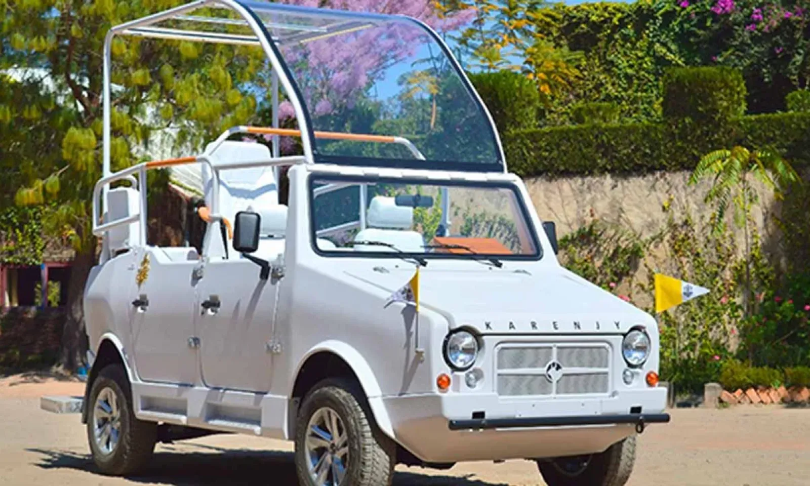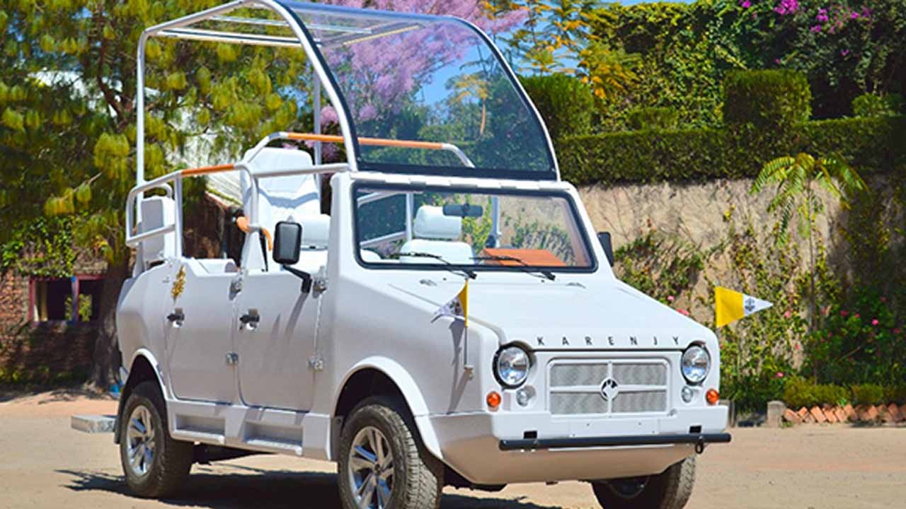 Le 4x4 cabriolet, fabriqué par la société malgache Karenjy, est une Mazana II complètement transformée pour l’occasion. Le 4x4, couvert d'un toit transparent, est de couleur blanche. A l'arrière du véhicule est placé un siège en cuir légèrement positionné en hauteur, siège destiné à Jorge Bergoglio. Le petit 4x4 malgache ressemble presque à la papamobile utilisée habituellement par le pape à Rome.