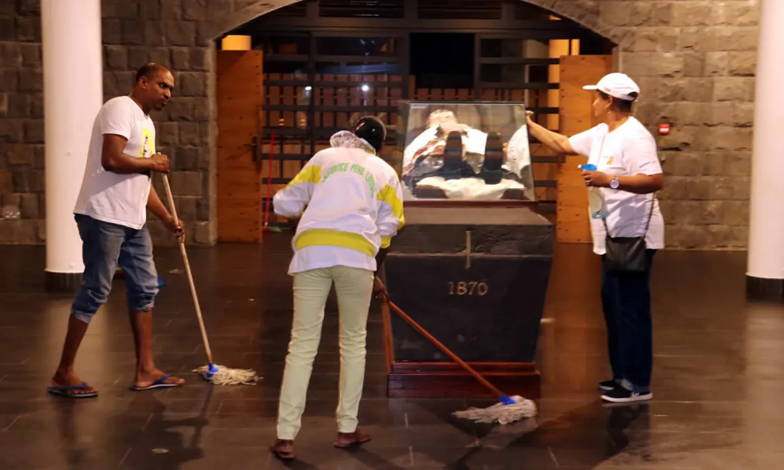 C’est vers 17h45, dimanche, que le caveau du Père Laval, à Sainte-Croix, a fermé ses portes. Les brancardiers sur place, aidés de quelques bénévoles, ont immédiatement procédé au balayage du sol et au nettoyage de la couverture vitrée du sarcophage. Des représentants du groupe Zezi Vre Zom ont ensuite aidé à démonter la structure métallisée à l’intérieur du caveau. Les pompiers, qui étaient non loin, n’ont pas tardé à nettoyer l’espace à grande eau. Pendant ce temps, la foule de fidèles qui assistait à la dernière messe du dimanche après-midi se dissipait graduellement. Le portail principal de la zone a été fermé au public vers 18h30. La police régulière a ensuite pris possession de l’espace.