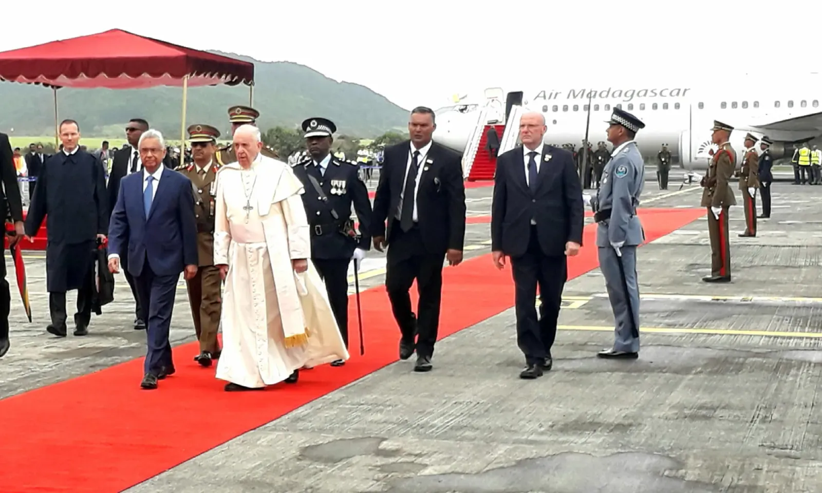 - 10 heures : La garde nationale fait son entrée, précédée par l’orchestre de la police. Les éléments de la Special Mobile Force, de la police régulière et de la National Coast Guard défilent. Entre-temps, la météo se gâte, une grosse averse frappe Plaisance, obligeant tout le monde à chercher refuge. L’appareil d’Air Madagascar qui transporte le pape et sa délégation doit arriver à 10h20.