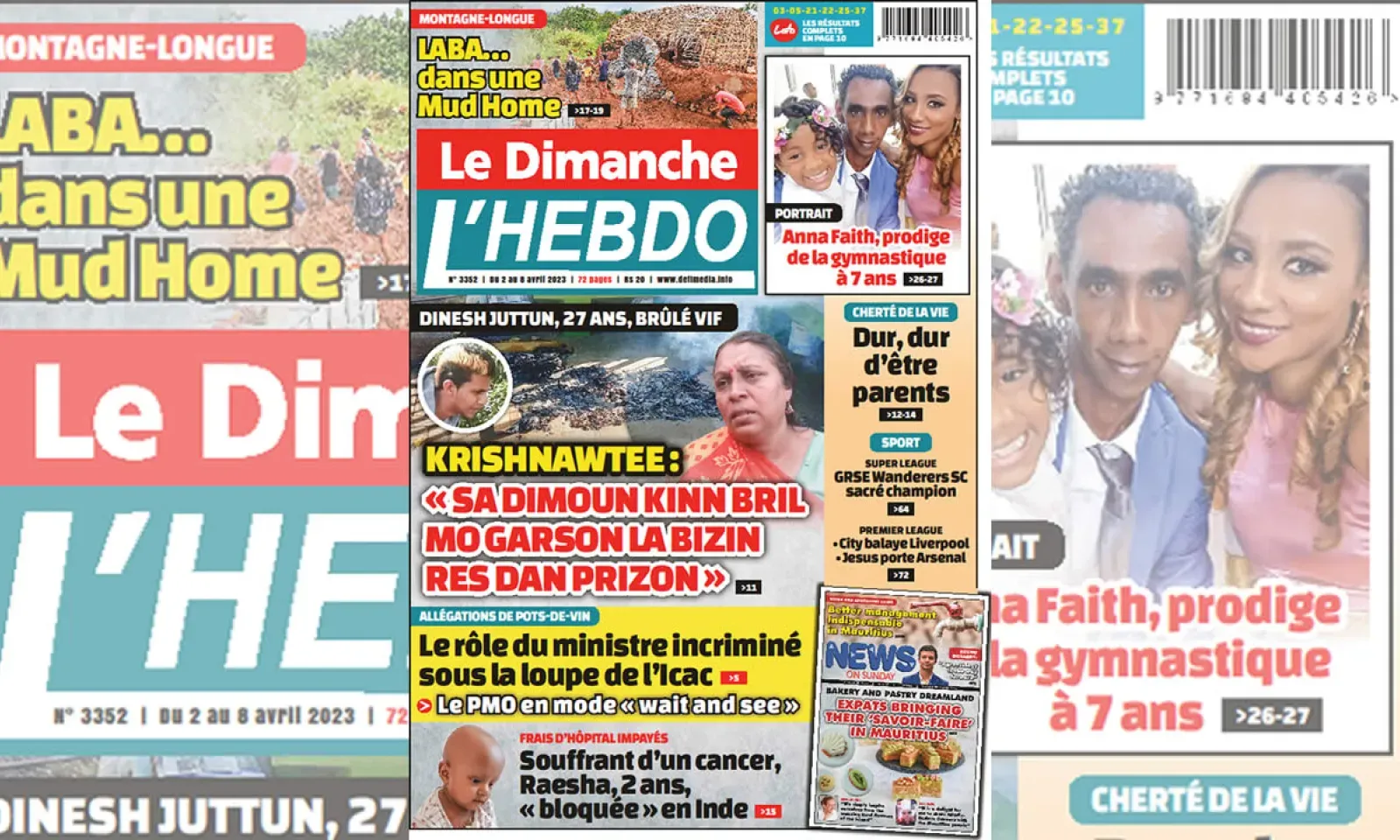 Image ? Voici la Une de Le Dimanche/L'Hebdo. Le journal est en vente à Rs 20 l'exemplaire aux endroits habituels (supermarchés, boutiques, tabagies, superettes). Bonne lecture ! Publicité View the discussion thread.